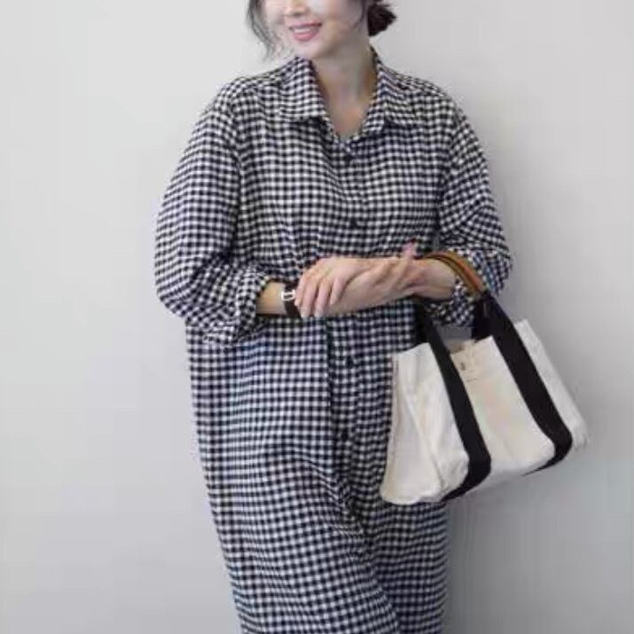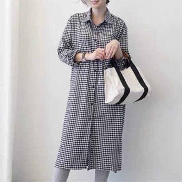ワンピース 羽織り シャツワンピース ロング ミディアム丈 袖あり 長袖 襟付き ポロカラー ストレート 前開き ボタン リネン コットン 柄 チェック柄 大人可愛い カジュアル おしゃれ お洒落 レトロ こなれ感 ラフ ルーズ 秋 冬 10代 20代 30代 40代 レディース 女性用 ママ デート お出かけ 女子会 休日 ショッピング 公園 着回し 普段使い 韓国 韓国系 オルチャン ファッション コーデ スタイル デイリー 色展開 黒 ブラック モノトーン サイズ M L XL ゆったり ゆる