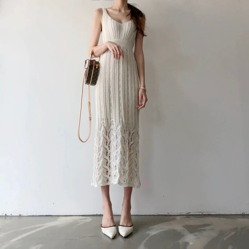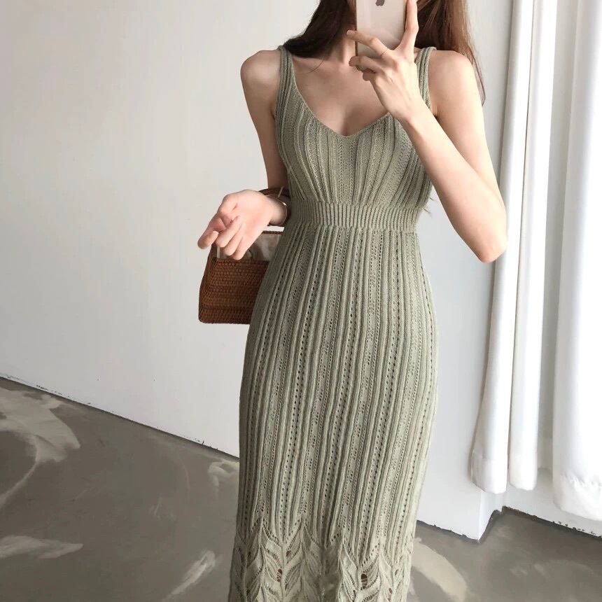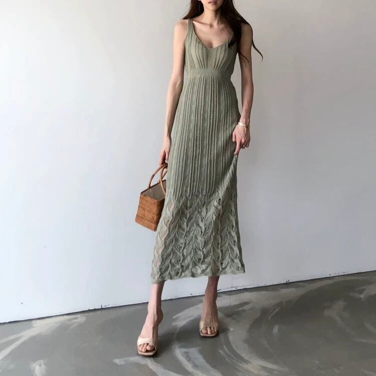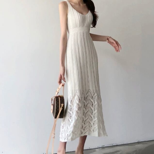 ワンピース ミモレ丈 袖なし ノースリーブ サスペンダー スリム タイト 細身 ポケット プルオーバー サマーニット 薄手 大人可愛い きれいめ シンプル カジュアル 大人 上品 お洒落 かっこいい レトロ 大人可愛い 大人女子 こなれ感 ラフ クール モード系 エレガント モダン 主役級 存在感 とろみ感 抜け感 無地 夏 20代 30代 40代 レディース デート お出かけ 女子会 お泊まり 休日 ショッピング 普段使い 韓国 オルチャン トレンド 流行 S M L XL ホワイト ブラック グリーン