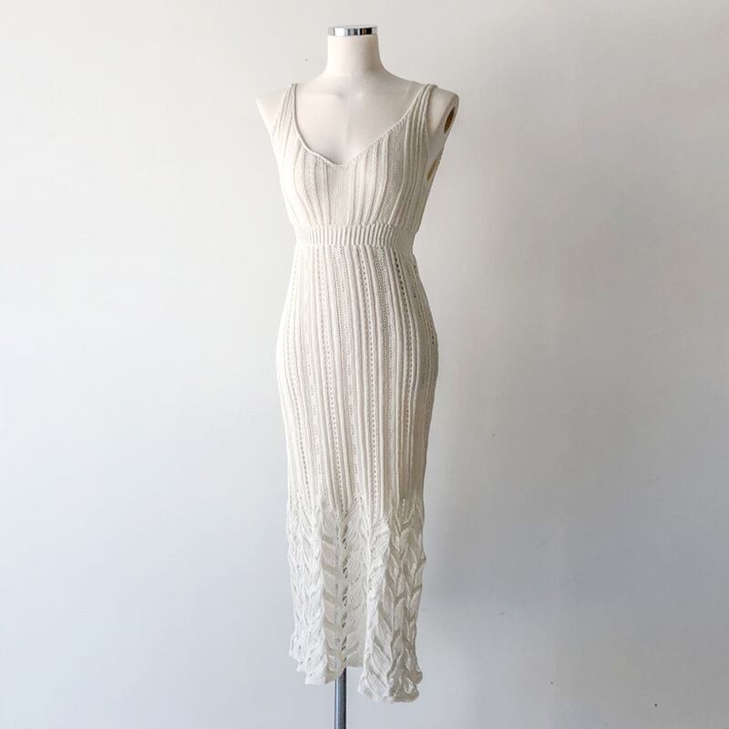 大人可愛いデザインのミモレ丈ワンピースです。袖なしのノースリーブデザインで、スリムなシルエットが魅力です。薄手のサマーニット素材で、涼しげな着心地を実現。カジュアルにもきれいめにもおしゃれに着こなせますよ。大人女子にぴったりのアイテムです。