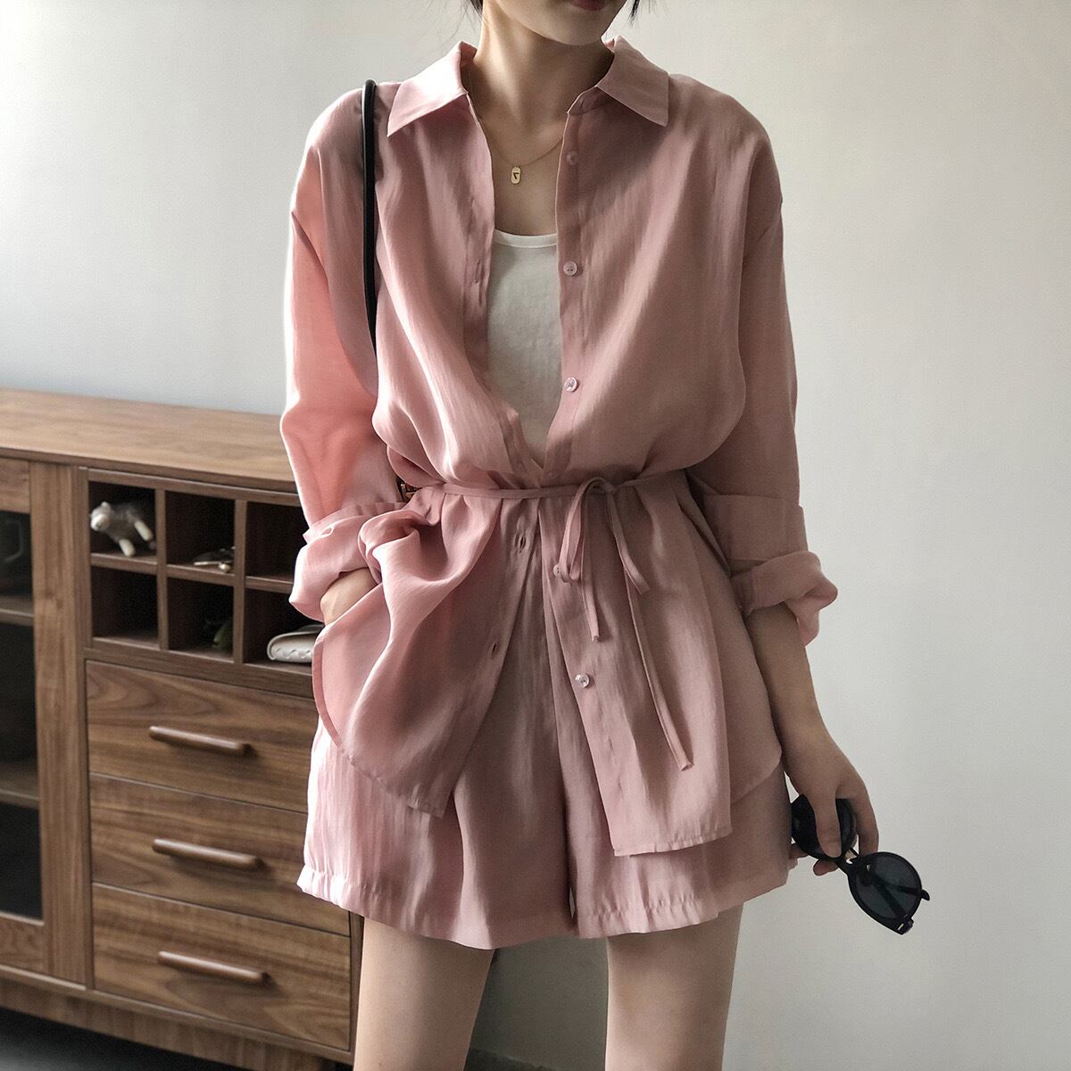 2点セット トップス ボトムス パンツ ショーパン ショートパンツ セットアップ シャツ 羽織り 透け感 上下セット ツーピース 無地 大人可愛い シンプル カジュアル 大人 上品 おしゃれ お洒落 オトナ可愛い こなれ感 ラフ ルーズ 抜け感 春 夏 秋 10代 20代 30代 40代 レディース 女性用 デート お出かけ 女子会 休日 リゾート ショッピング 公園 着回し 普段使い 韓国 韓国系 オルチャン ファッション コーデ スタイル トレンド デイリー ピンク アプリコット ダークグレー M L