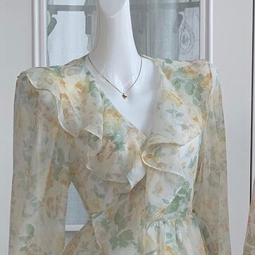 ワンピース ミモレ丈 長袖 Vネック フレア Aライン シフォン フリル リボン 透け感 シースルー 柄 花柄 小花柄 フラワー かわいい フリフリ おしゃれ お洒落 ラブリー キュート ガーリー ロリ ロリータ ドール ドーリー フェアリー フェミニン 春 夏 秋 10代 20代 30代 レディース 女性用 デート お出かけ 女子会 休日 ショッピング 公園 普段使い 韓国 韓国系 オルチャン ファッション コーデ スタイル 美脚 インスタ映え デイリー 色展開 黄色 イエロー ピンク サイズ S M