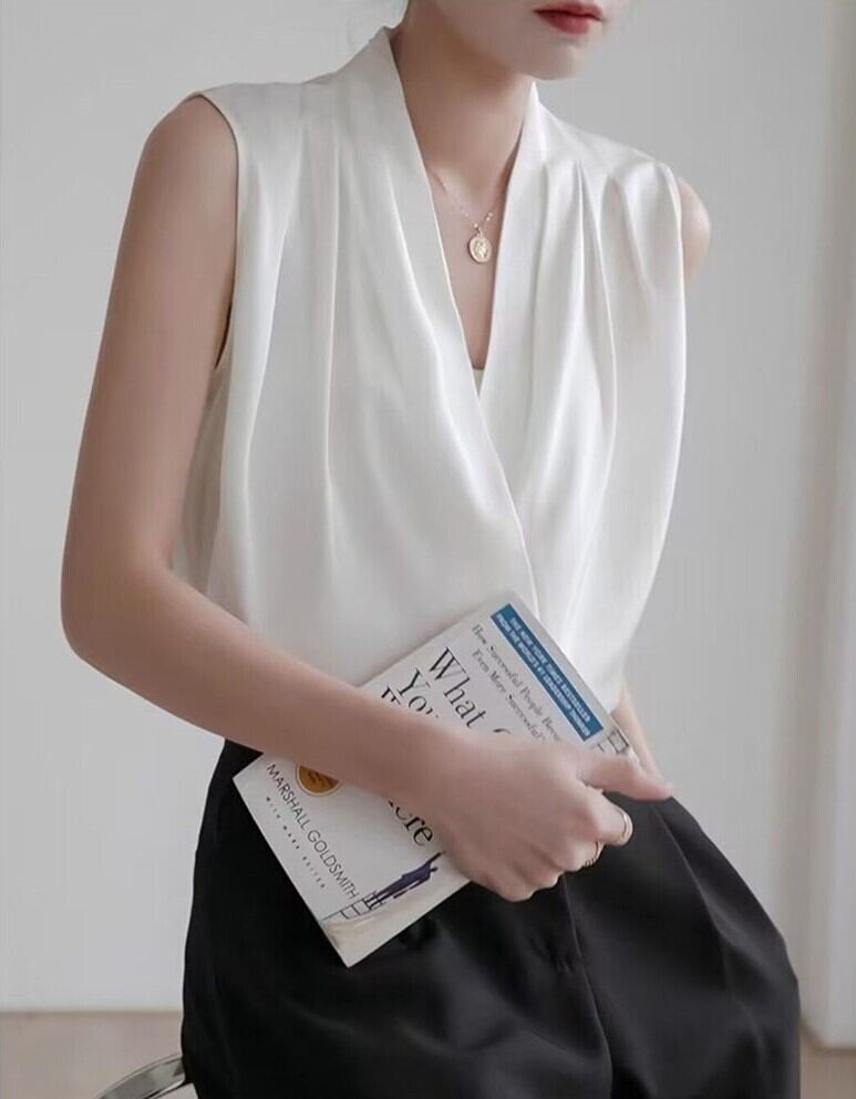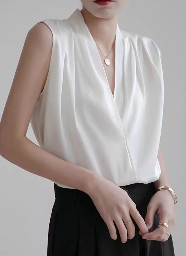 シンプルなVネックノースリーブと七分袖シャツ。
