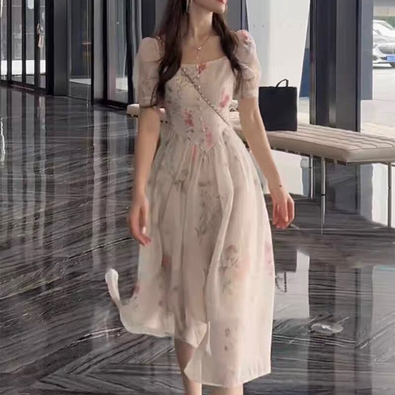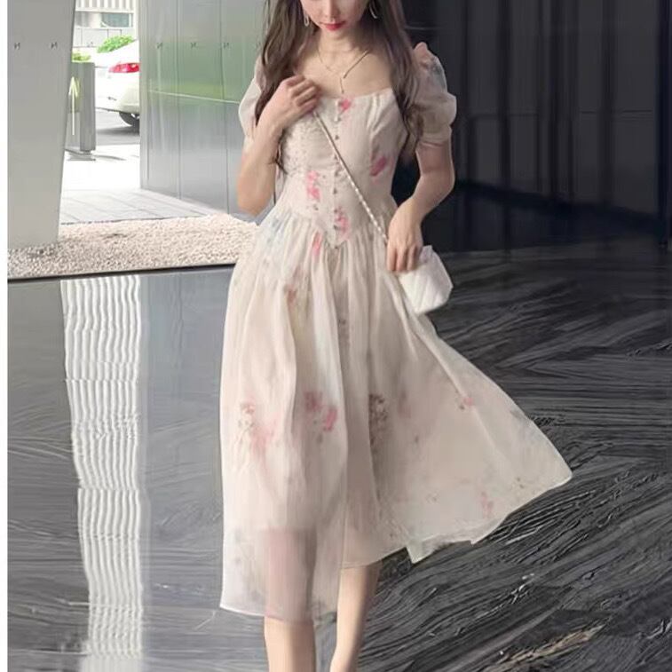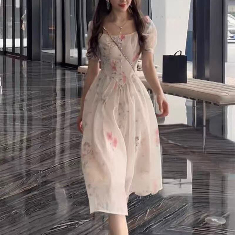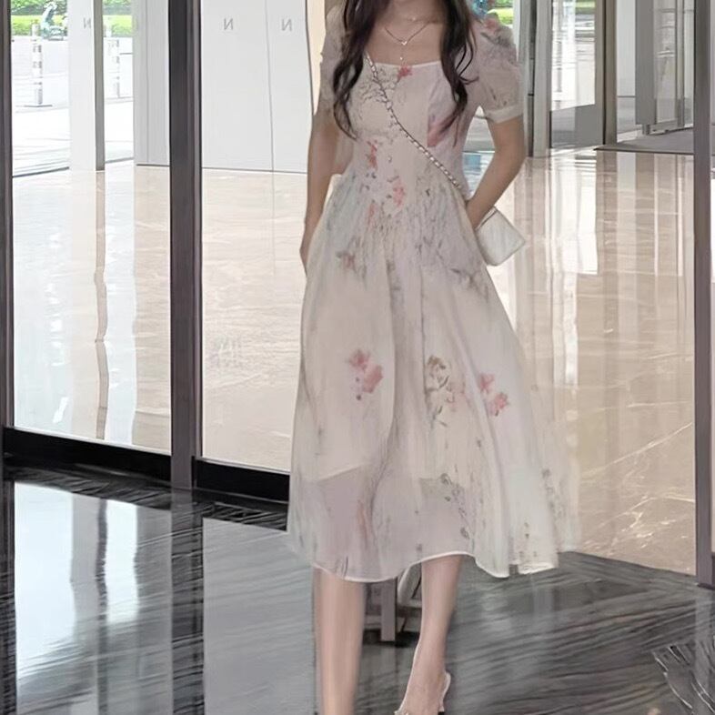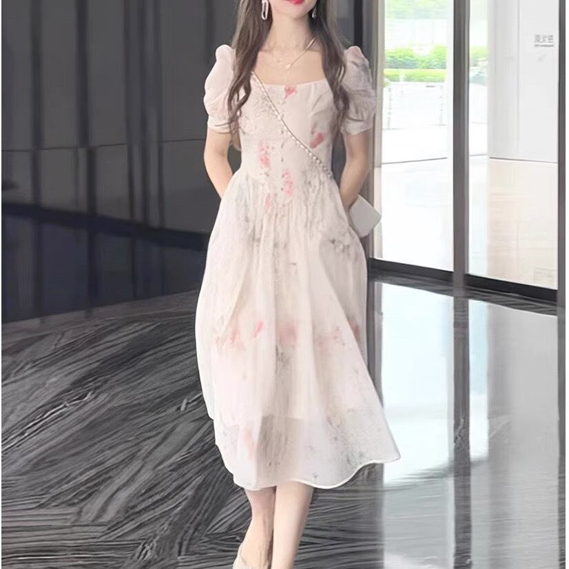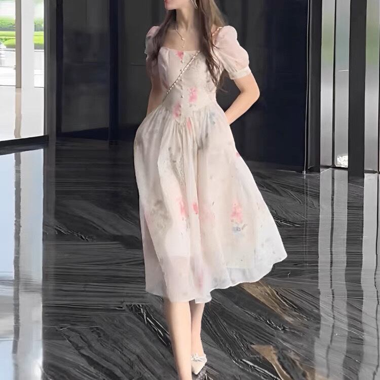 ワンピース フレアワンピース 膝下 ミモレ ミモレ丈 パフスリーブ スクエアネック フレア Aライン シフォン ハイウエスト 透け感 シースルー 柄 花柄 小花柄 フラワー かわいい おしゃれ お洒落 ラブリー キュート ガーリー ドール ドーリー フェアリー フェミニン 春 夏 10代 20代 30代 40代 レディース 女性用 デート お出かけ 女子会 休日 ショッピング 普段使い 韓国 韓国系 オルチャン ファッション コーデ スタイル モテ あざと デイリー 白 ホワイト サイズ S M L XL