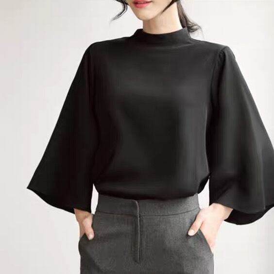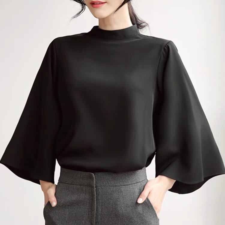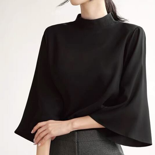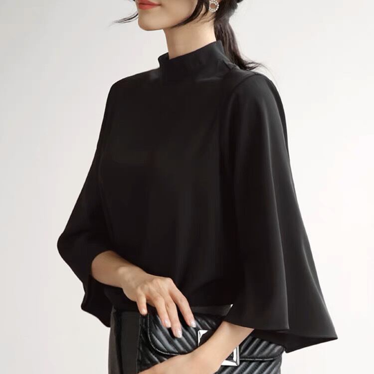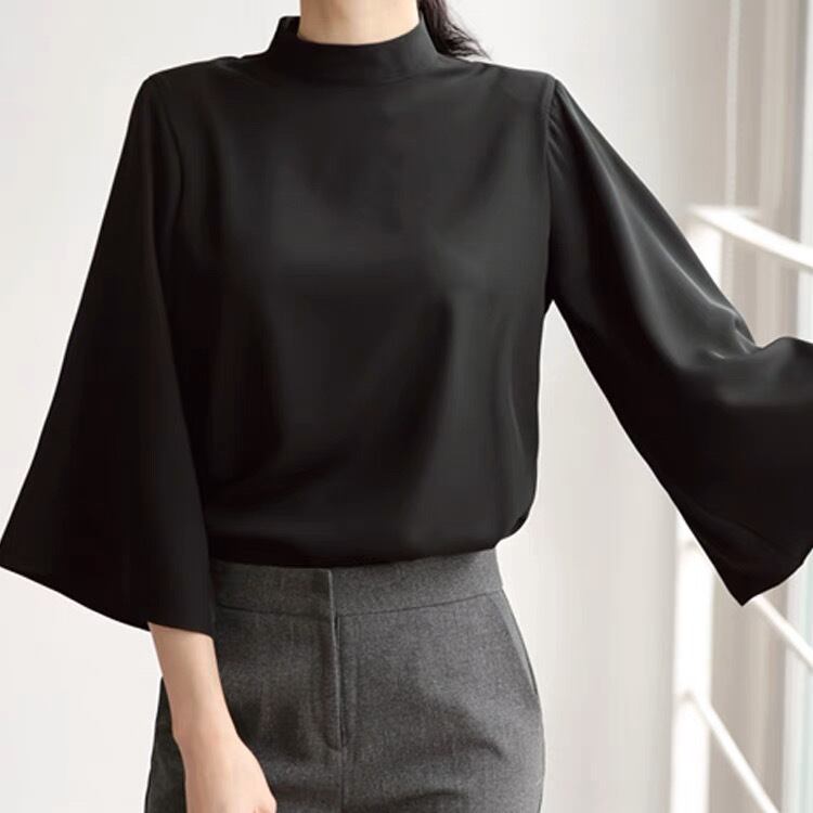 スタンドカラーとベルスリーブが印象的な、シンプルかつオシャレなデザインです。