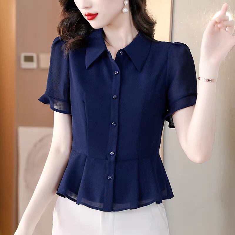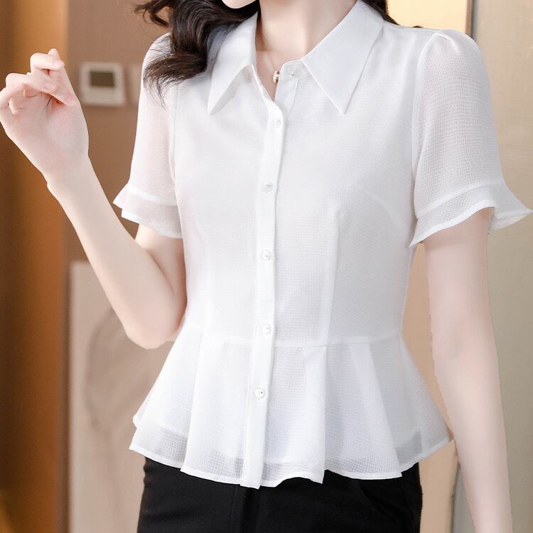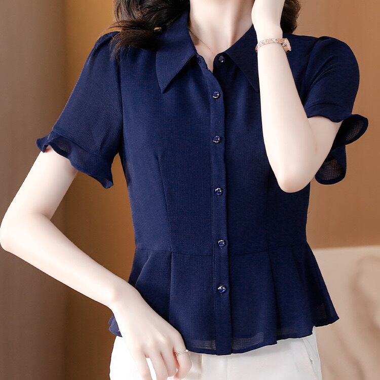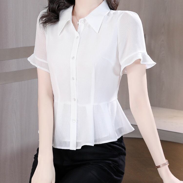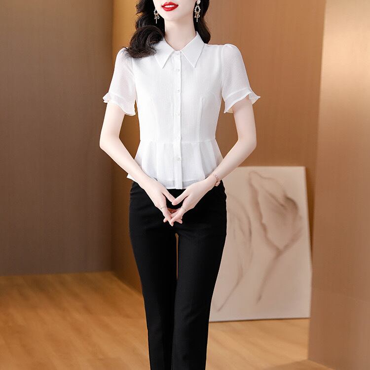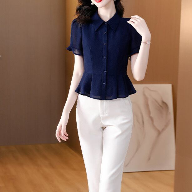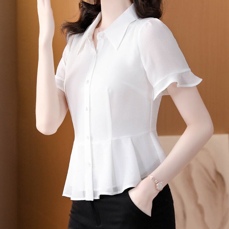 トップス シャツ 白シャツ 半袖 ポロカラー スリム フリル ボタン 無地 きれいめ シンプル 大人 上品 おしゃれ お洒落 フォーマル 春 夏 入学式 入園式 卒業式 卒園式 10代 20代 30代 40代 50代 レディース 女性用 オフィス ビジネス OL 通勤 デート お出かけ 女子会 休日 ショッピング 着回し 普段使い 韓国 韓国系 オルチャン ファッション コーデ スタイル デイリー 色展開 白 ホワイト ネイビー ネイビーブルー サイズ S M L XL 2XL 3XL 大きいサイズ
