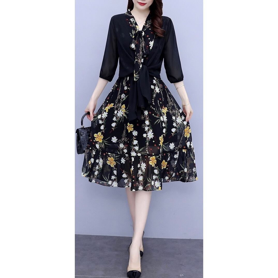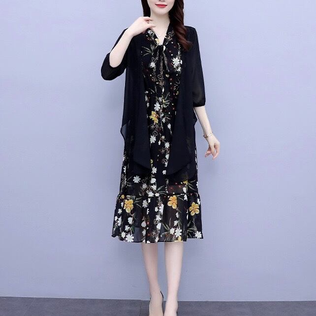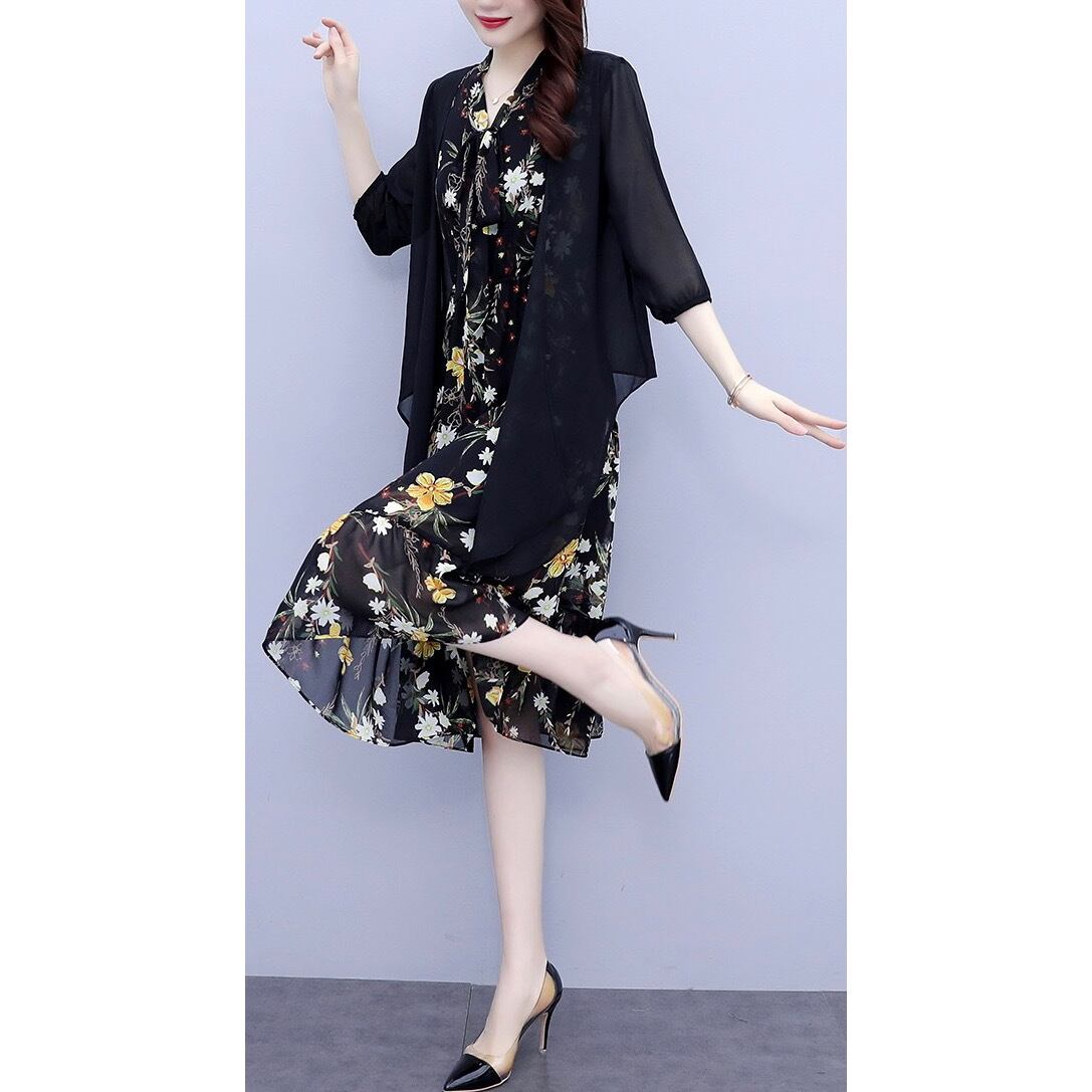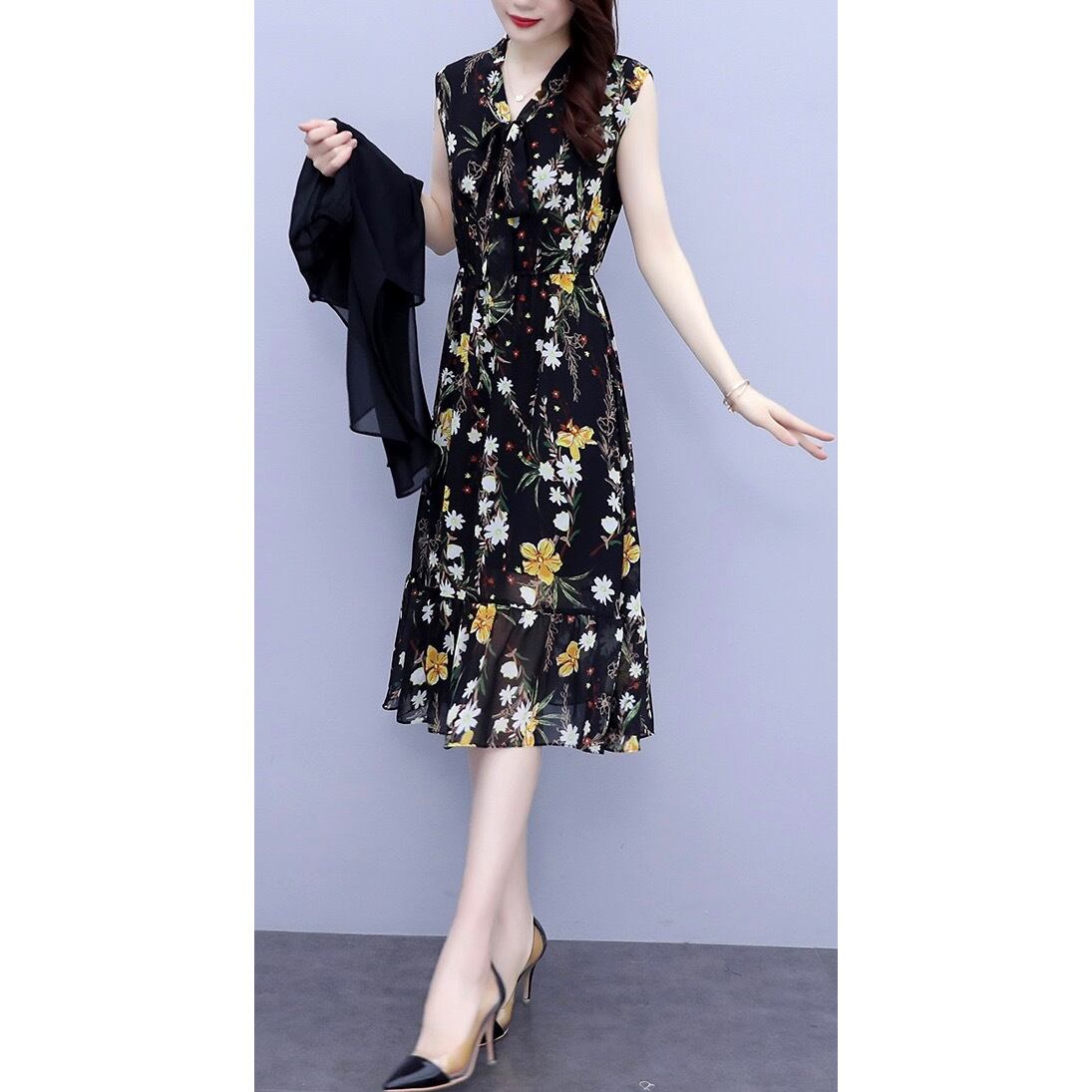 2点セット ワンピース カーディガン 膝下 ミモレ丈 ノースリーブ フレア Aライン シフォン ハイウエスト ツーピース 無地 柄 花柄 小花柄 フラワー 大人可愛い 大人 おしゃれ お洒落 レトロ ガーリー フェミニン 春 夏 10代 20代 30代 40代 50代 レディース 女性用 デート お出かけ 女子会 休日 ショッピング 着回し 普段使い 韓国 韓国系 オルチャン ファッション コーデ スタイル 美脚 デイリー 黒 ブラック サイズ M L XL 2XL 3XL 4XL 大きいサイズ 大きい