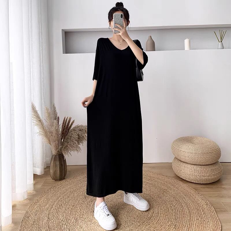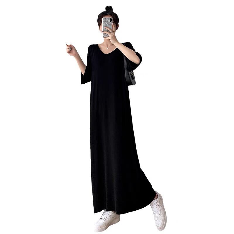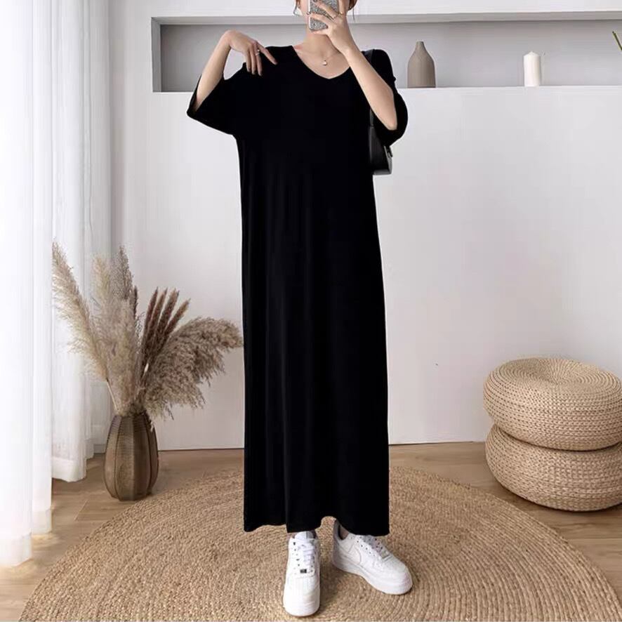 ワンピース Tシャツ ロング ロング丈 5分袖 五分袖 Vネック ワイド Aライン 無地 大人可愛い シンプル カジュアル おしゃれ お洒落 オトナ可愛い こなれ感 ラフ ルーズ 春 夏 10代 20代 30代 40代 レディース 女性用 ママ デート お出かけ 女子会 お泊まり 休日 アウトドア ショッピング 公園 着回し 普段使い 韓国 韓国系 オルチャン ファッション コーデ スタイル 楽ちん デイリー 色展開 黒 ブラック 青 ブルー アプリコット サイズ フリーサイズ ワンサイズ ゆったり ゆる