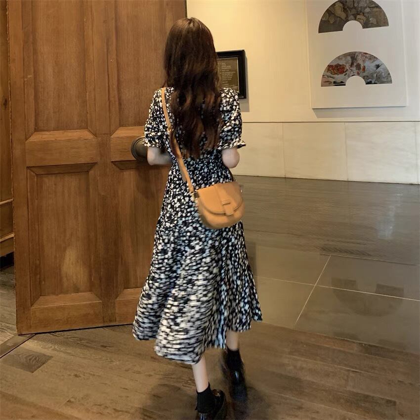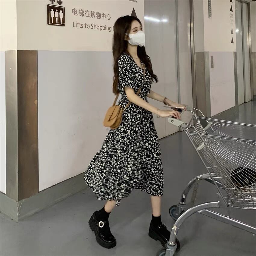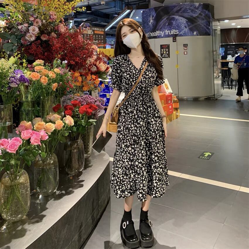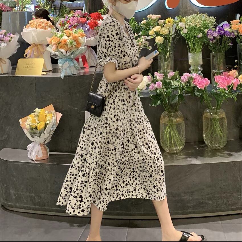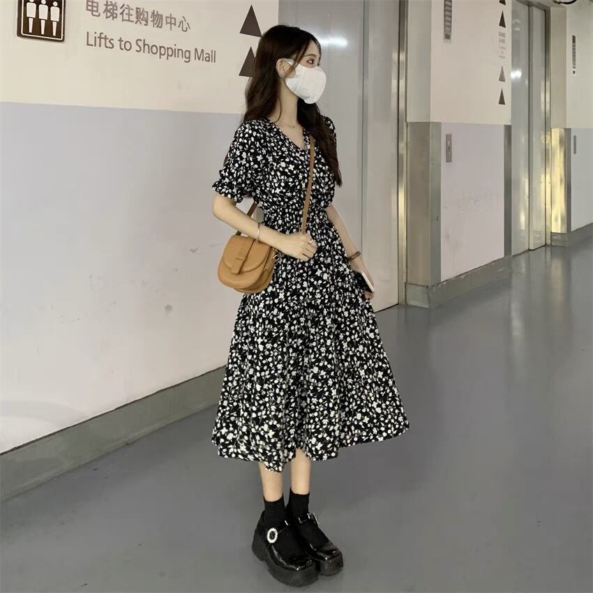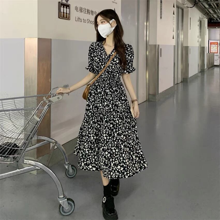 ワンピース ロングスカート フレアワンピース ミモレ ミモレ丈 パフスリーブ Vネック フレア Aライン シフォン ハイウエスト 柄 花柄 小花柄 フラワー 大人可愛い シンプル おしゃれ お洒落 オトナ可愛い ガーリー フェアリー フェミニン 春 夏 10代 20代 30代 40代 レディース 女性用 ママ デート お出かけ 女子会 休日 ショッピング 公園 普段使い 韓国 韓国系 オルチャン ファッション コーデ スタイル モテ 色展開 白 ホワイト 黒 ブラック モノトーン サイズ フリーサイズ