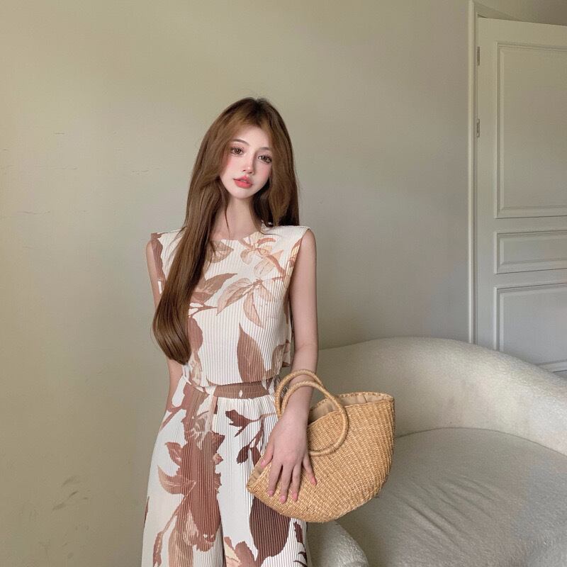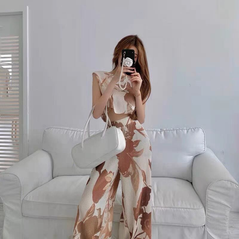 2点セット トップス ボトムス パンツ ワイドパンツ ロング丈 ノースリーブ ラウンドネック ハイウエスト 上下セット ツーピース 柄 花柄 フラワー プリント 大人可愛い カジュアル ギャル カジュアル 大人 おしゃれ ラフ ルーズ 春 夏 10代 20代 30代 40代 レディース 女性用 ママ デート お出かけ 女子会 休日 ショッピング 公園 着回し 普段使い 韓国 韓国系 オルチャン ファッション コーデ スタイル 楽ちん 脚長 デイリー 白 ホワイト ブラウン サイズ フリーサイズ ワンサイズ