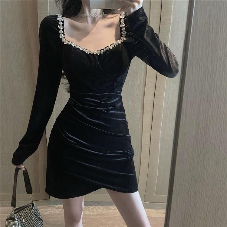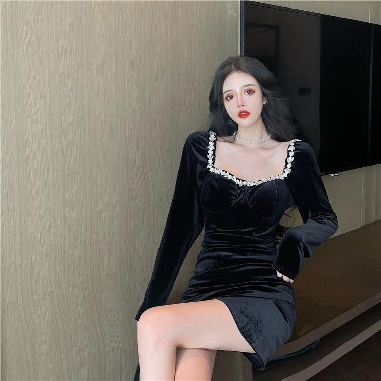ドレス パーティードレス イブニングドレス ブラックドレス ショート丈 長袖 スクエアネック 襟なし タイト スリム 細身 ハイウエスト 大人可愛い きれいめ 大人 上品 お洒落 かっこいい レトロ クール モード系 セクシー エレガント モダン 主役級 存在感 フォーマル とろみ感 抜け感 クラシック スタイリッシュ 無地 10代 20代 レディース 韓国系 オルチャン ファッション コーデ スタイル 美脚 脚長 高見え 格上げ 冬 結婚式 二次会 披露宴 お呼ばれ パーティー S M L ブラック