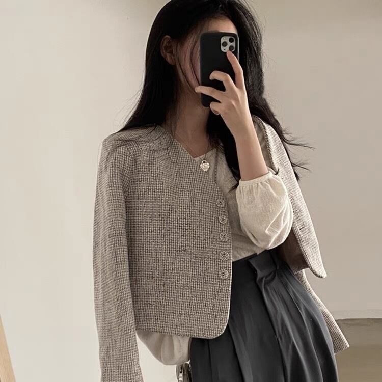 アウター ジャケット 上着 羽織り ショート ショート丈 袖あり 長袖 Vネック ストレート 前開き ボタン 柄 チェック柄 シンプル カジュアル 上品 おしゃれ お洒落 レトロ こなれ感 ラフ マニッシュ ルーズ クール モード系 抜け感 ハンサム 秋 冬 入学式 入園式 卒業式 卒園式 10代 20代 30代 40代 レディース 女性 デート お出かけ 女子会 休日 ショッピング 着回し 普段使い 韓国 韓国系 オルチャン ファッション コーデ スタイル トレンド デイリー 大人カラー フリーサイズ