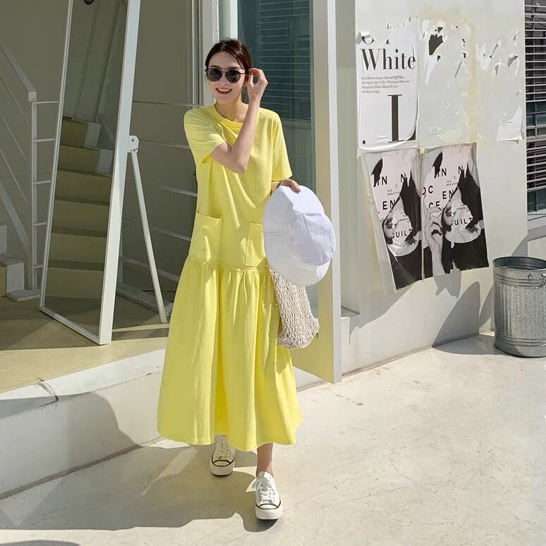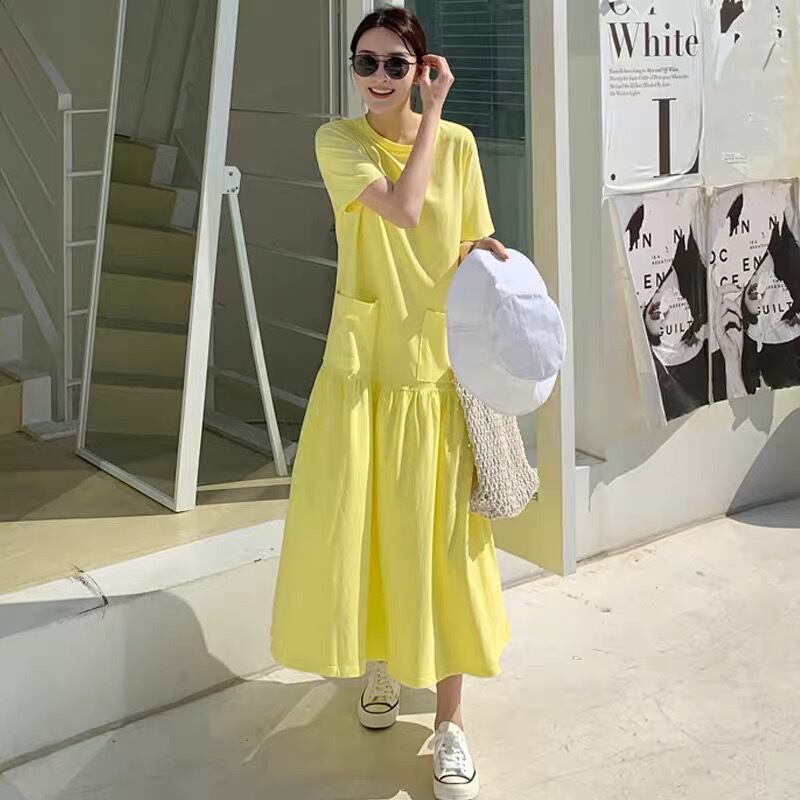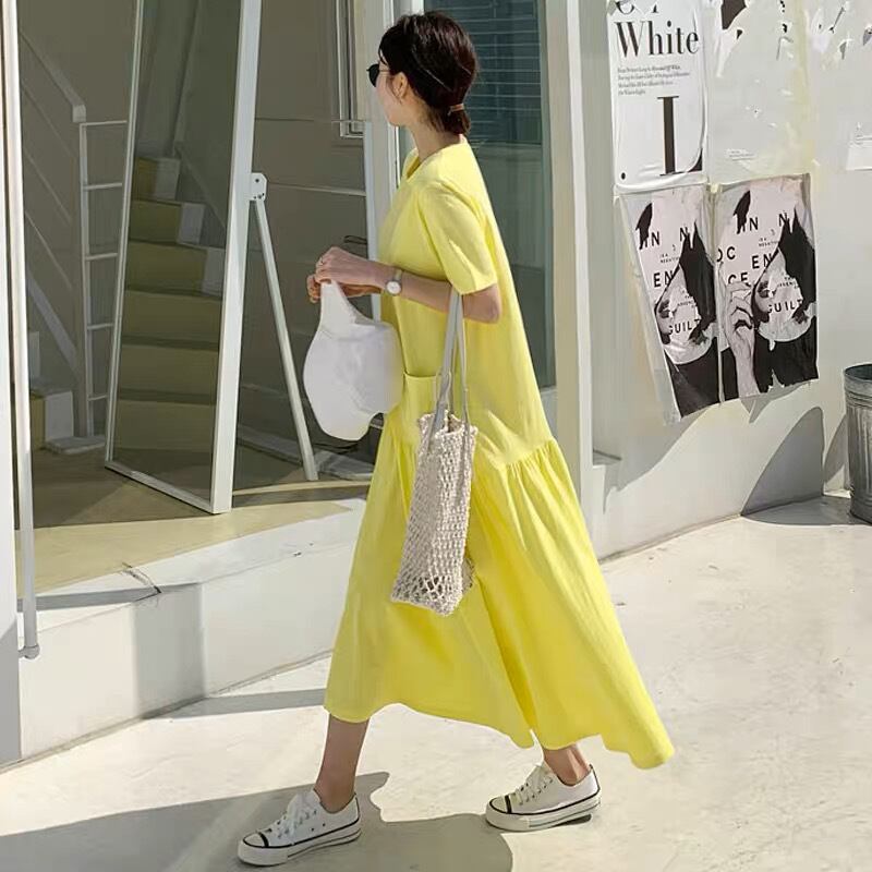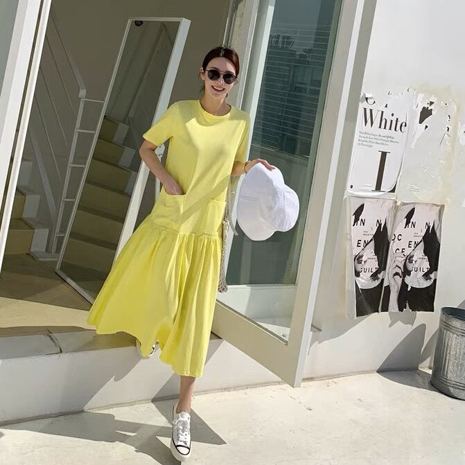 ワンピース Tシャツ Tシャツワンピース ミモレ丈 ロング丈 ミドル丈 袖あり 半袖 ラウンドネック フレア スリム Aライン 無地 大人可愛い シンプル カジュアル おしゃれ お洒落 こなれ感 ラフ スポーティー ルーズ 春 夏 10代 20代 30代 40代 レディース 女性用 デート お出かけ 女子会 休日 リゾート ショッピング 公園 着回し 普段使い 韓国 韓国系 オルチャン ファッション コーデ スタイル 楽ちん インスタ映え デイリー 黄色 イエロー サイズ S M L XL ゆったり ゆる