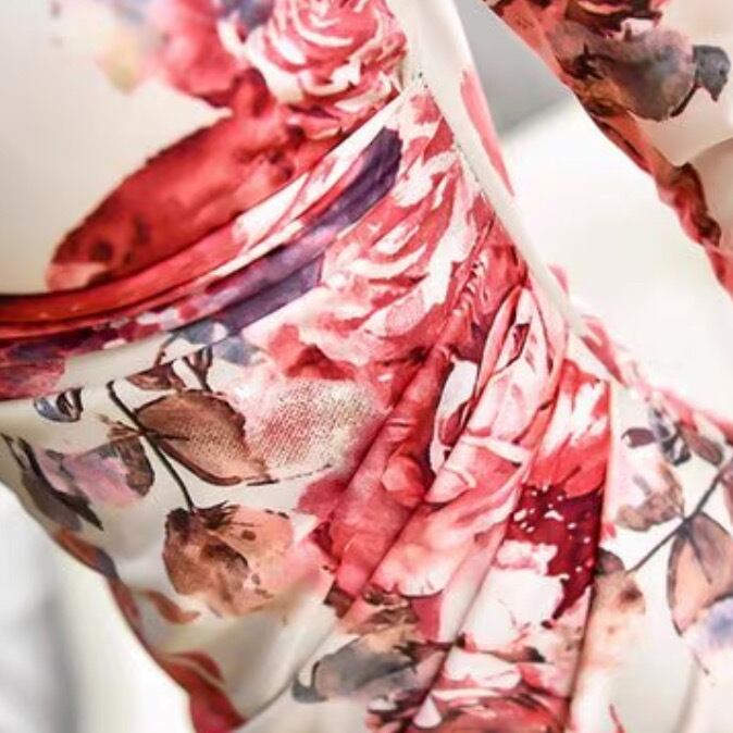 水彩風な花柄のプリントが、華やかさとエレガントさを醸し出してくれます。