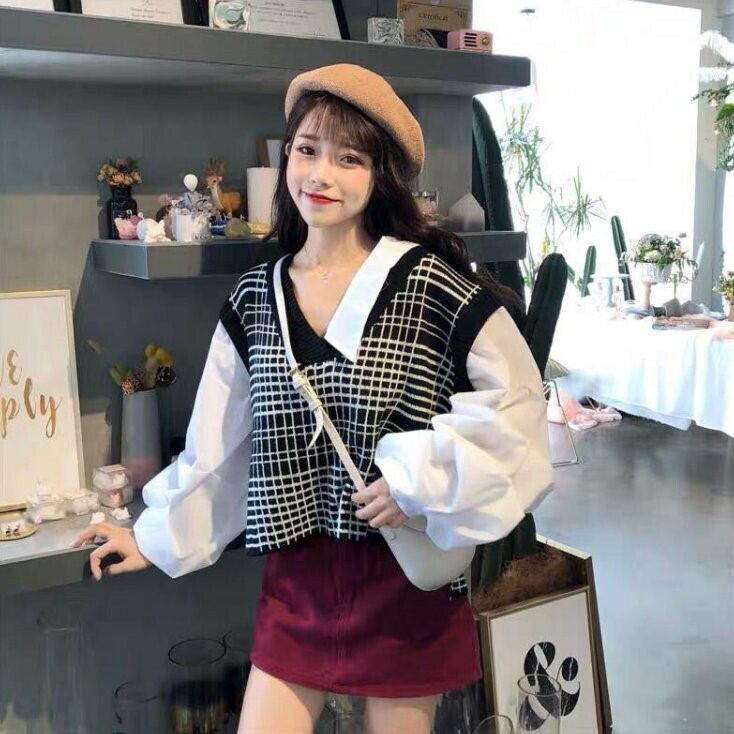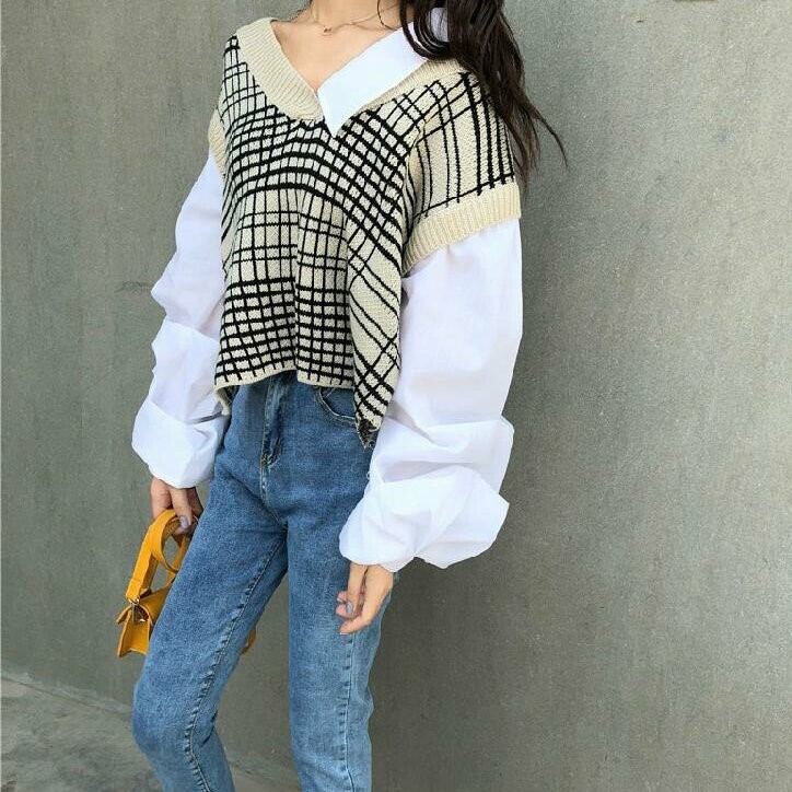 レディース トップス シャツ ニット セーター プルオーバー ショート 長袖 ランタンスリーブ Vネック 切り替え かわいい 大人可愛い きれいめ シンプル カジュアル おしゃれ かっこいい レトロ ガーリー ルーズ 個性的 ラブリー 格子柄 春 秋 ママ 通勤 学生 学校 通学 デート お出かけ 旅行 女子会 ホテル ショッピング コンサート ライブ カフェ 韓国 コーデ 楽ちん 美脚 普段使い 着回し モテ トレンド 流行 インスタ映え S M L XL ゆったり ゆる ブラック アプリコット