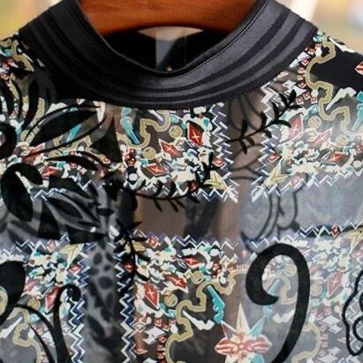 トップスのプリントシフォンのブラウスは、個性的でオシャレなデザイン。袖まわりや首後ろのビジューは、エレガントさを醸し出します。