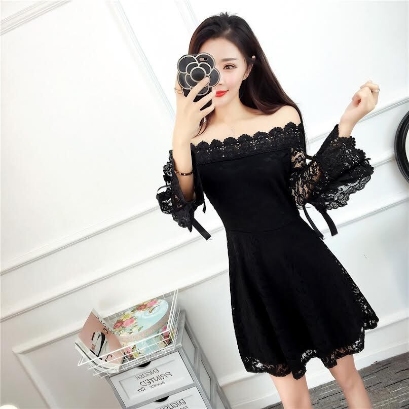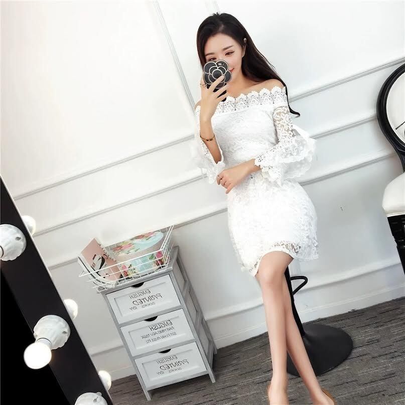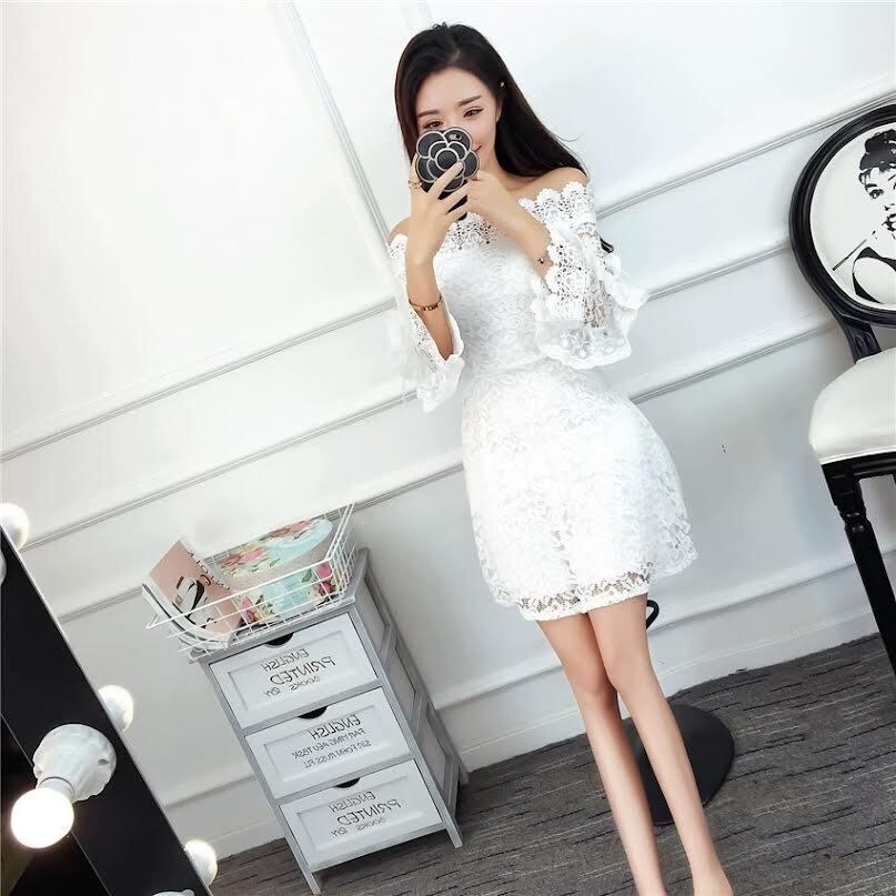 ドレス パーティードレス Aラインドレス ショート丈 袖あり 七分袖 オフショルダー 襟なし Aライン スリム 細身 レース ハイウエスト 透け感 胸元 谷間 谷間魅せ 大人可愛い きれいめ 大人 上品 お洒落 かっこいい レトロ ラブリー キュート ガーリー セクシー 主役級 存在感 とろみ感 抜け感 華やか お嬢様 清楚 10代 20代 レディース 韓国系 オルチャン ファッション スタイル 美脚 脚長 高見え 格上げ 夏 結婚式 二次会 披露宴 お呼ばれ パーティー ワンサイズ ホワイト ブラック