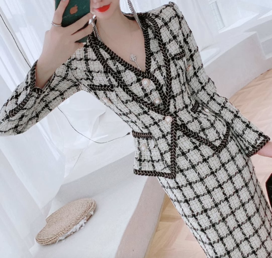 大人可愛い女性らしさを演出するセットアップが登場しました。ジャケットとワンピースが一体化したデザインで、スタイリッシュなシルエットと上品なタイトなラインが魅力です。オフィスやパーティー、デートにもぴったりです。