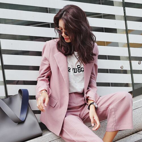 大人クラシカルな雰囲気のあるパンツスーツ。