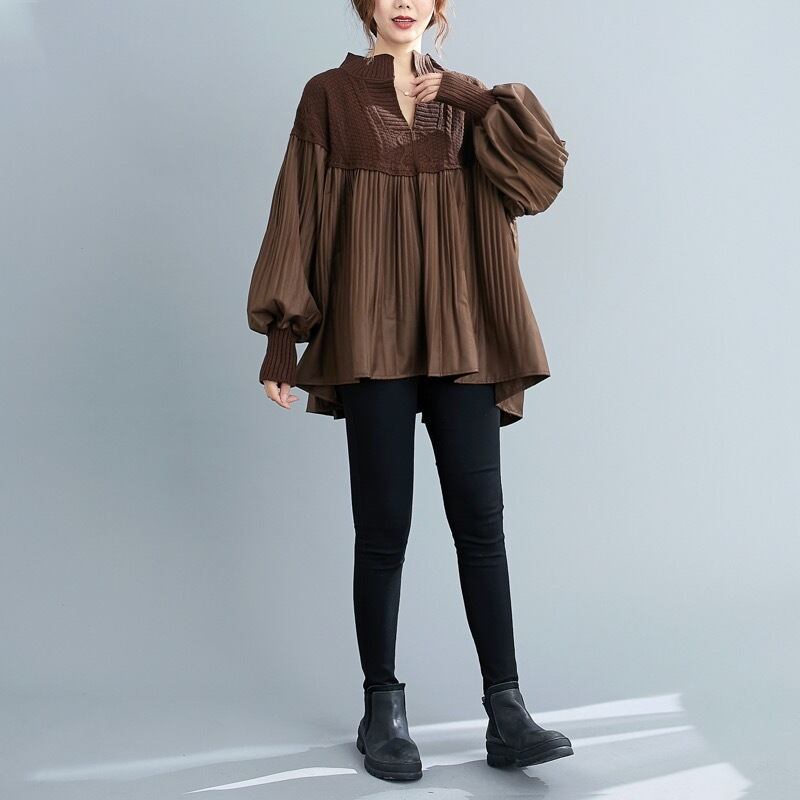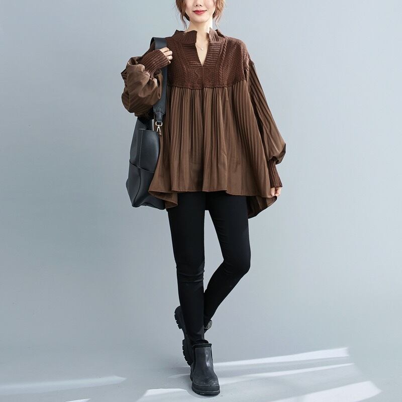 トップス ブラウス プルオーバー 長袖 ボリューム袖 Vネック フレア Aライン ドッキング プリーツ 切り替えデザイン リブ ニット 無地 大人可愛い シンプル カジュアル おしゃれ お洒落 キュート ガーリー フェミニン 秋 冬 10代 20代 30代 40代 レディース 女性用 デート お出かけ 女子会 休日 ショッピング 公園 着回し 普段使い 韓国 韓国系 オルチャン ファッション コーデ スタイル モテ 体系カバー デイリー 色展開 黒 ブラック 茶色 ブラウン 秋色 サイズ L ワンサイズ