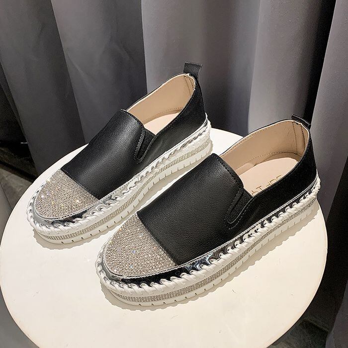 爪先部分にあしらわれたラインストーンが印象的なカジュアルフラットシューズ