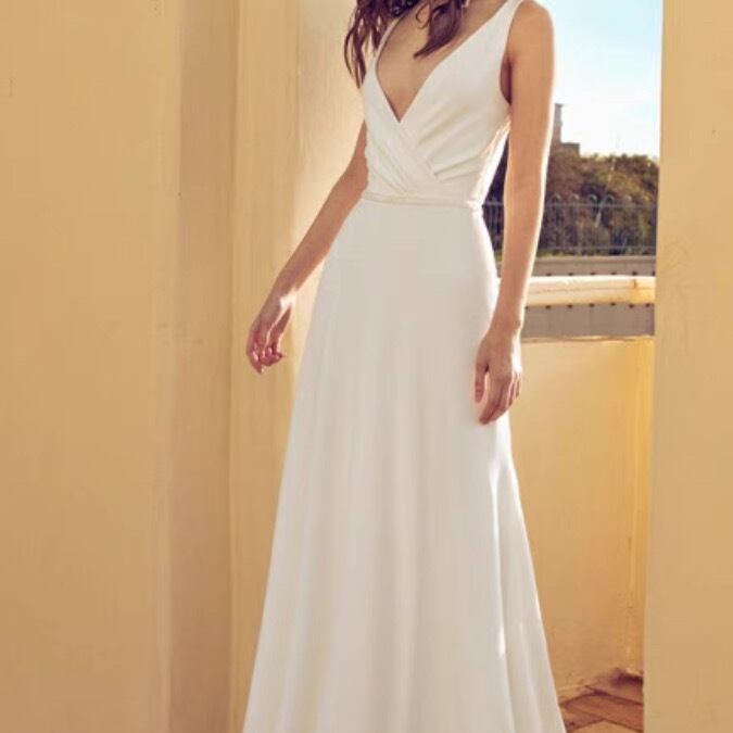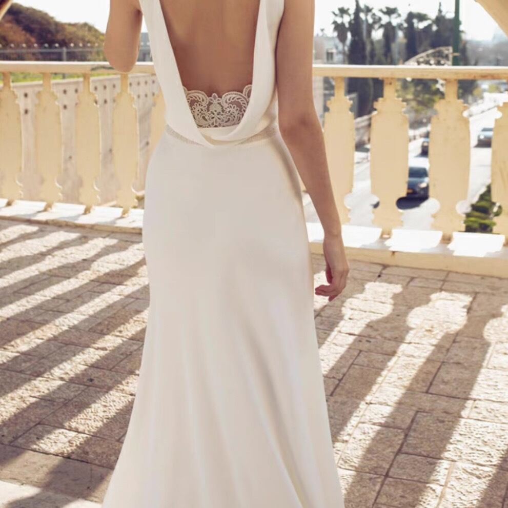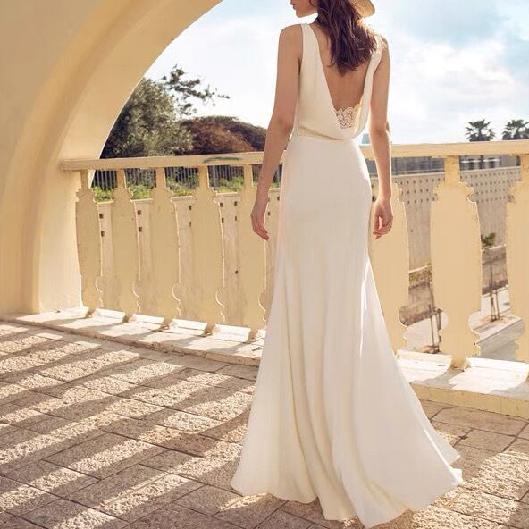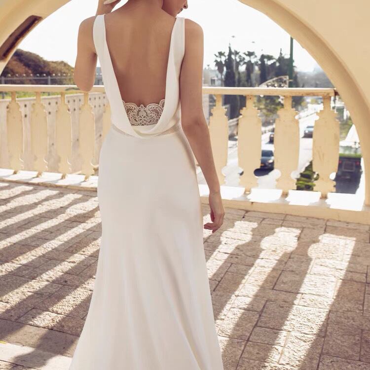 シンプルかつ、背中が広く開いたバックコンシャスなデザインが印象的な