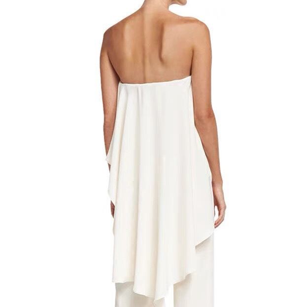 前後差のあるヘムデザイン印象的でオシャレなチューブトップのパンツドレス。