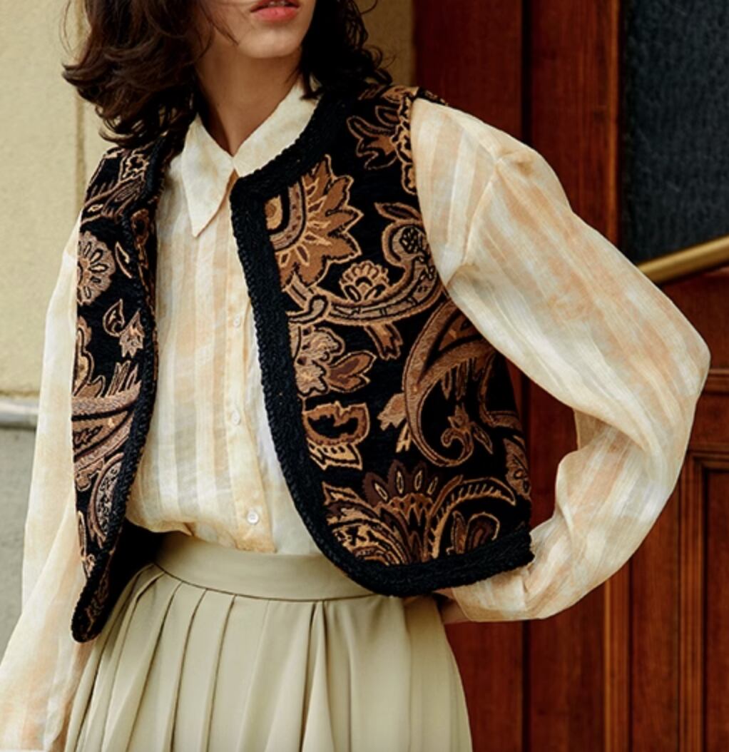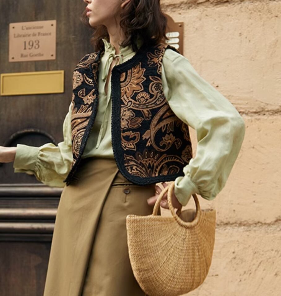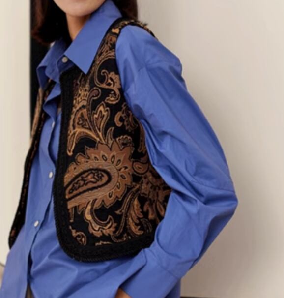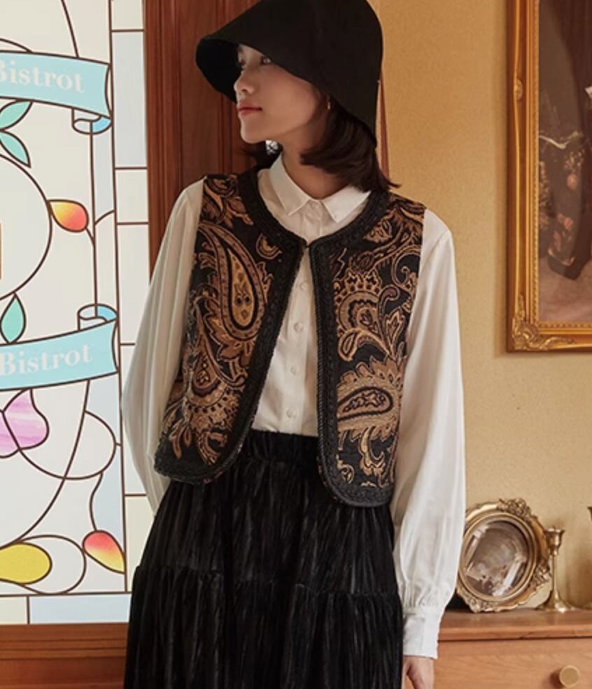 個性的なレトロなベストが登場しました!ショート丈なので、1枚で主役級の存在感を放ちます。大人可愛いスタイルから、カジュアルな着こなしまで、幅広いコーディネートに対応できますよ。ヴィンテージ感漂うデザインは、こなれ感を演出してくれます。上品さもありながら、ちょっぴり個性的なクールさも感じられるアイテムです。