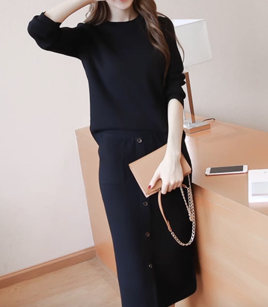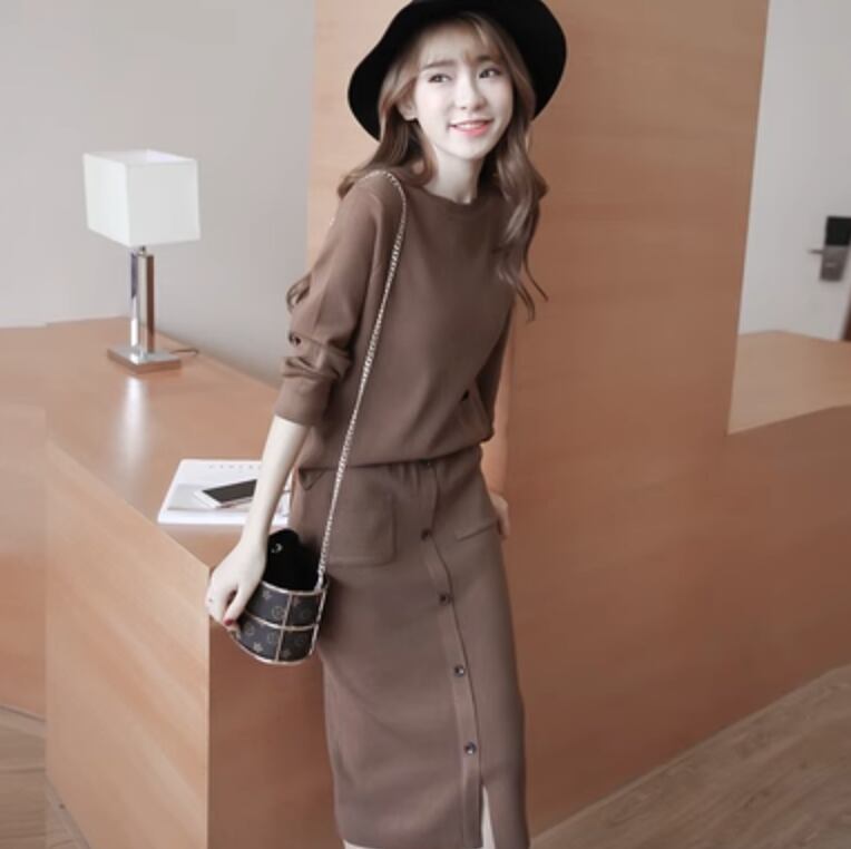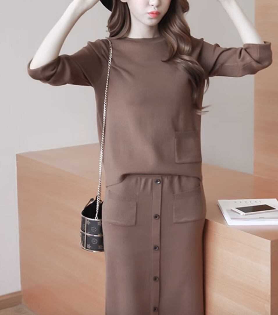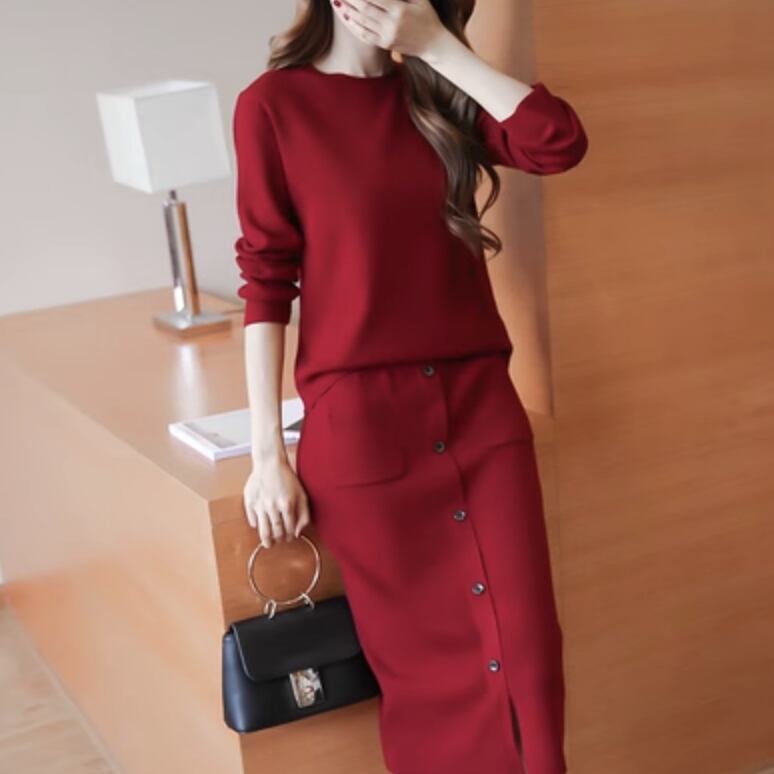 シックな雰囲気を演出するレディーススカートとトップスのセットアップです。大人可愛いスタイルを叶える長袖のニットセーターと、女性らしいシルエットのスカートがセットになっています。シンプルでありながら個性的なデザインが特徴で、カジュアルからきれいめまで幅広いコーディネートに対応しています。