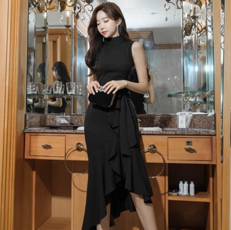 シックな雰囲気漂うワンピースをご紹介します。ノースリーブで上品なデザインで、ミモレ丈とタイトスリムのシルエットが女性らしい魅力を引き立てます。シンプルながらも個性的なデザインで、カジュアルからきれいめまで幅広いスタイリングに対応します。大人可愛い、きれいめ、シックなイメージにピッタリです。