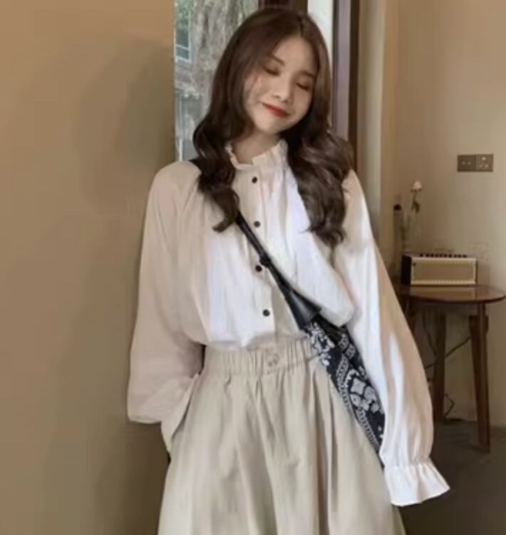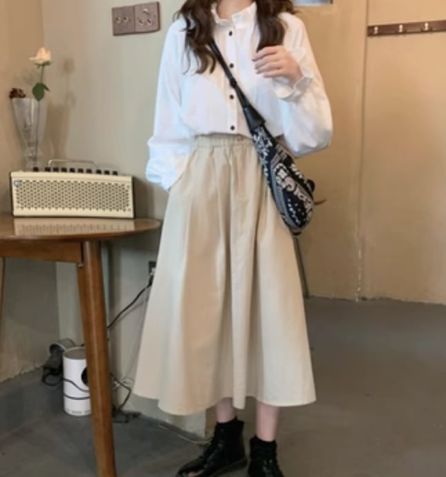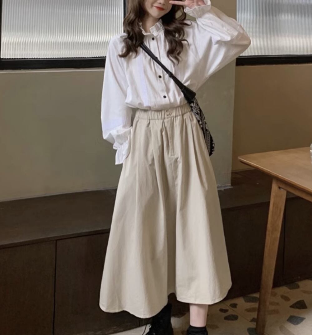 スカート トップス シャツ ブラウス ロング 長袖 ハイウエスト かわいい 大人可愛い きれいめ シンプル カジュアル 上品 おしゃれ かっこいい レトロ こなれ感 ラフ ガーリー ルーズ 個性的 クール モード系 エレガント 主役級 存在感 ヴィンテージ ラブリー キュート ゴシック 都会的 ラグジュアリー クラシカル ナチュラル OL 学生 デート お出かけ イベント 旅行 女子会 休日 ショッピング カフェ コーデ 楽ちん 普段使い 着回し モテ インスタ映え S M 白 ホワイト アプリコット