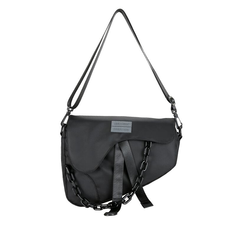 スタイリッシュで使い勝手の良いショルダーバッグ。丸型のデザインで、カジュアルな印象を与えます。使い勝手も抜群で、ボタンやファスナーで開閉するので、中身の安全面もしっかりと考慮されています。チェーンのデザインがアクセントになり、スタイリッシュさを演出。ナイロン素材を使用しているため、防水性も抜群です。