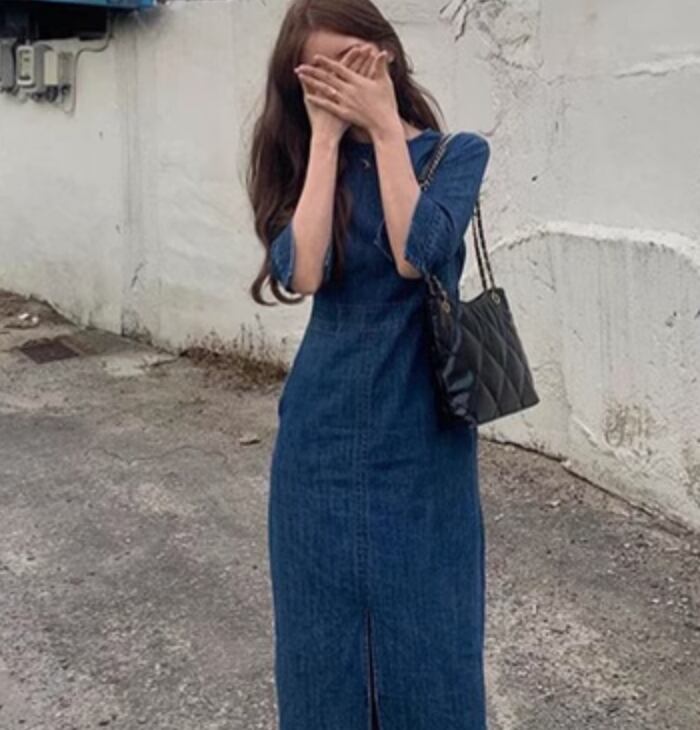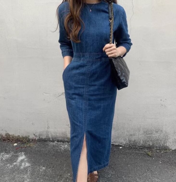 ワンピース デニム ロング タイト スリム 細身 かわいい 大人可愛い きれいめ シンプル カジュアル 上品 おしゃれ かっこいい レトロ こなれ感 ラフ ガーリー ルーズ 個性的 クール モード系 エレガント 主役級 存在感 抜け感 ヴィンテージ ラブリー キュート ゴシック 都会的 ラグジュアリー クラシカル ナチュラル 春 秋 OL 学生 デート お出かけ イベント 旅行 女子会 休日 ショッピング カフェ コーデ 楽ちん 普段使い 着回し モテ インスタ映え S M L ブルー