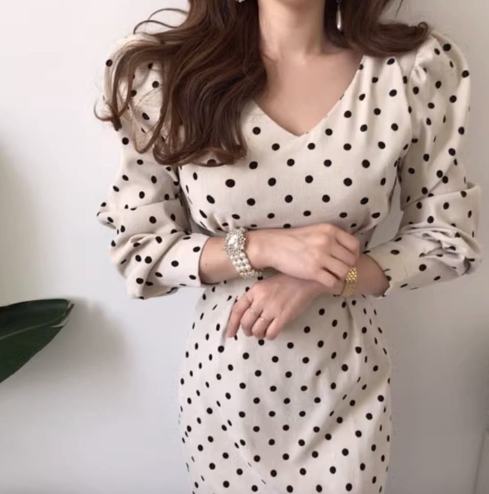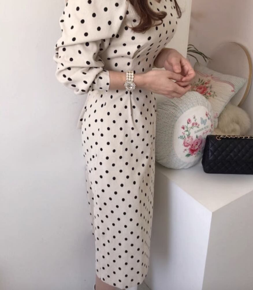 レトロな雰囲気が魅力のワンピース。長袖のタイトなデザインで、大人可愛い印象を演出します。シンプルでありながら、上品な雰囲気も併せ持っています。カジュアルな場面からきれいめなシーンまで、幅広いスタイリングに対応できるアイテムです。