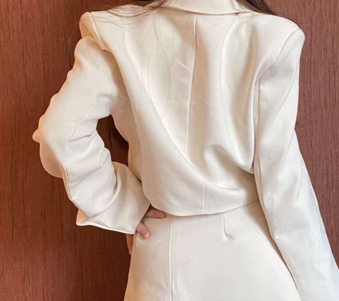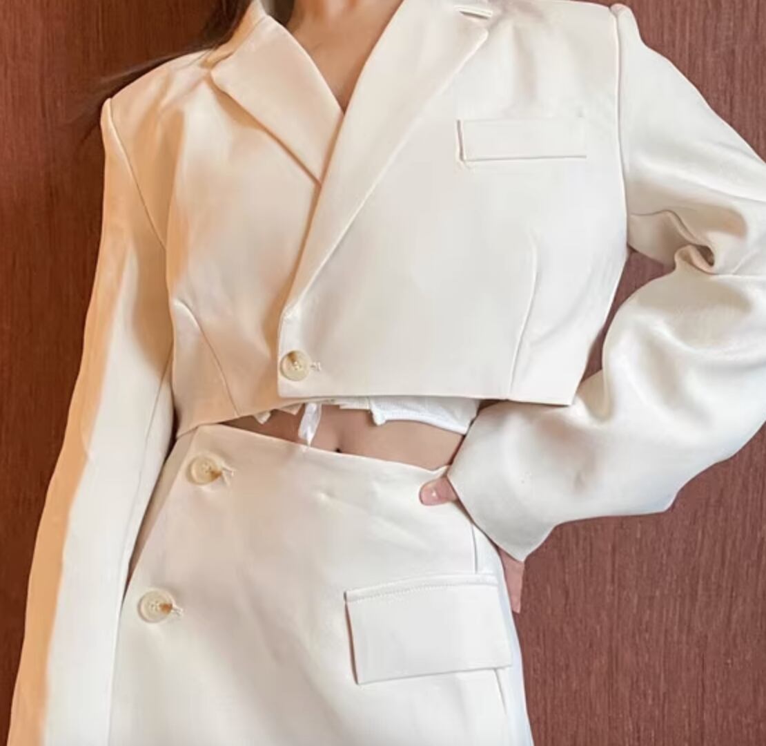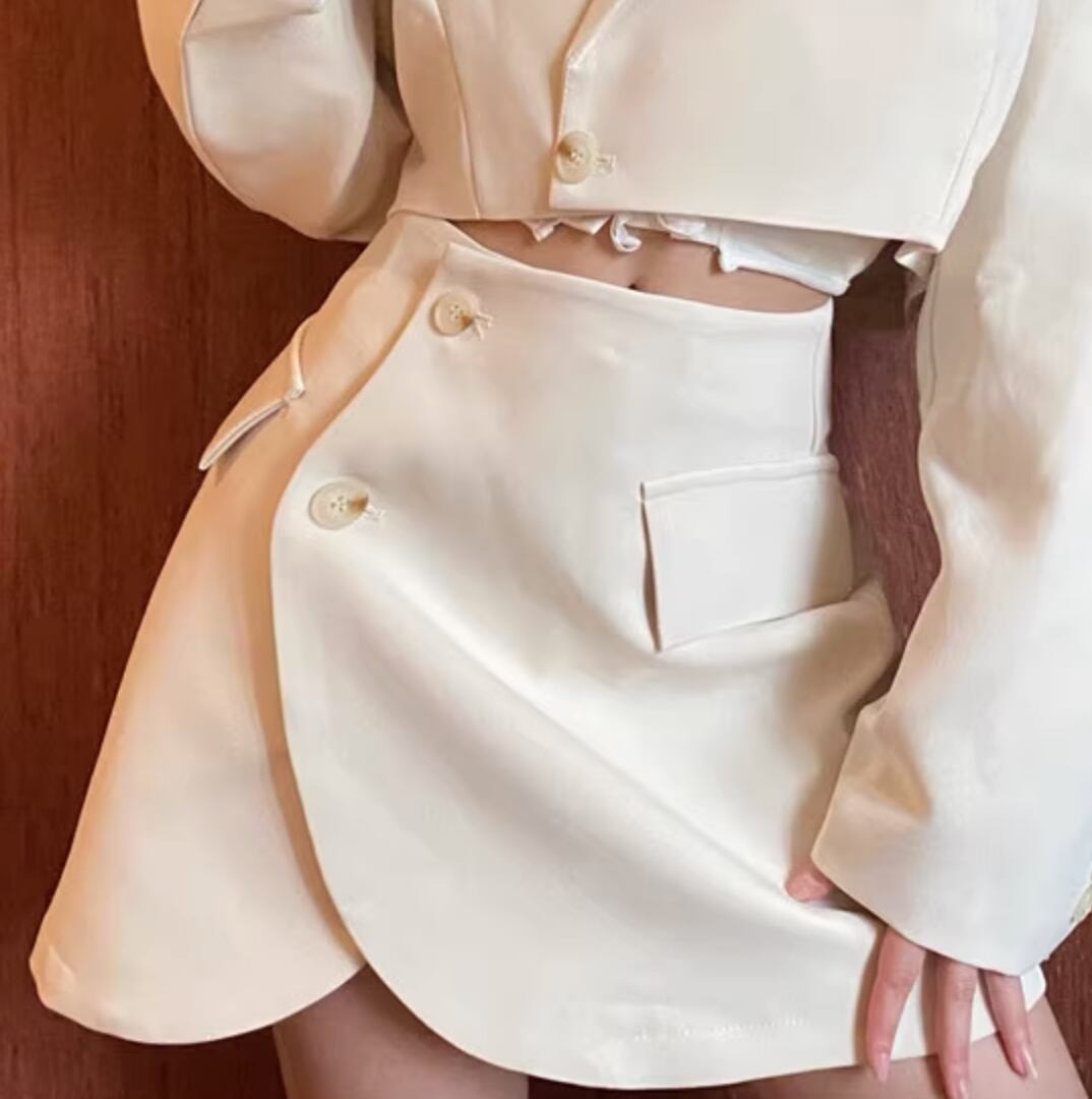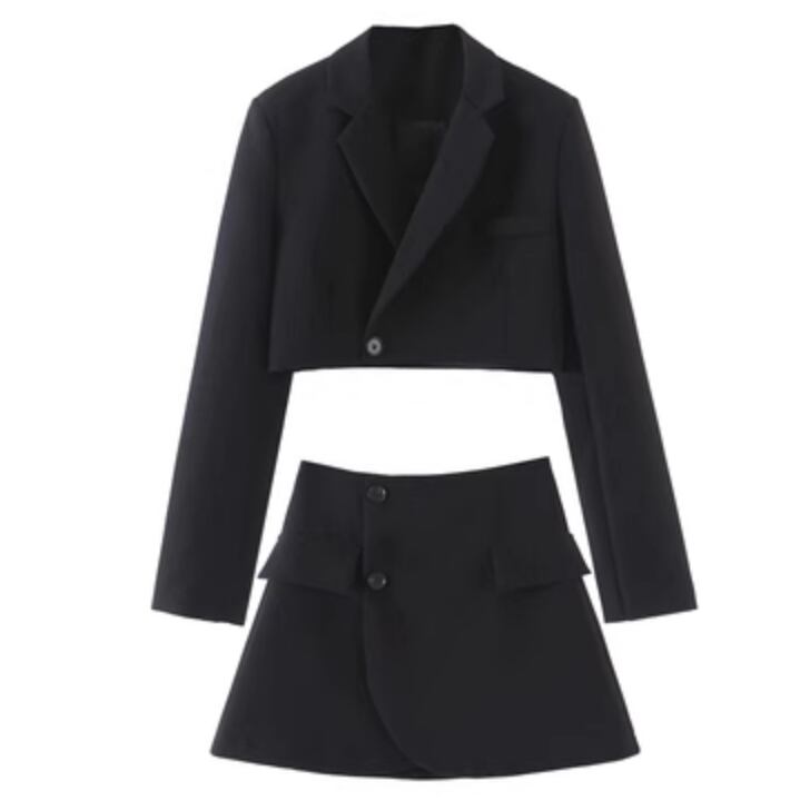 上品な印象を演出するシックなセットアップが登場しました。ショート丈のスカートと長袖のジャケットが組み合わさったこのセットアップは、かわいさと大人っぽさが程よく調和したデザインです。シンプルでありながら個性的な雰囲気を持ち、きれいめながらもカジュアルにも着こなせます。