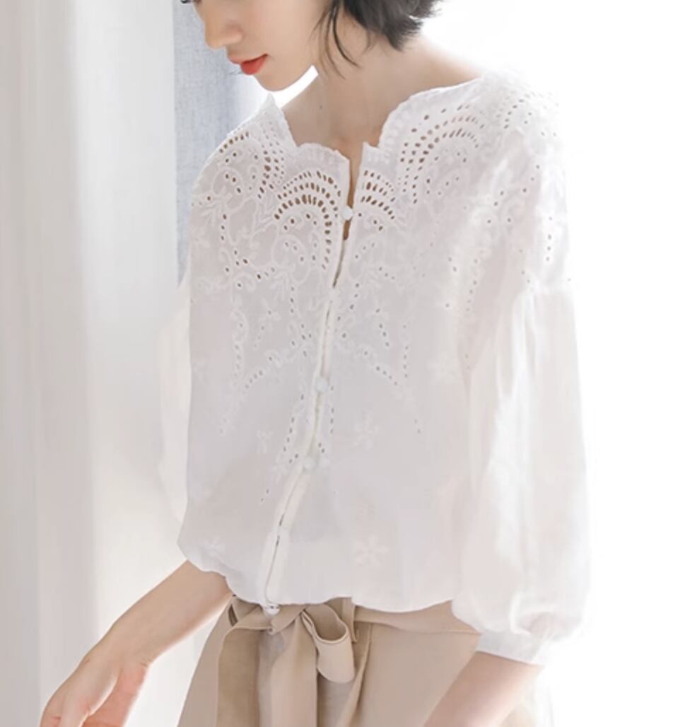 レトロな雰囲気漂う半袖シャツ。レースの繊細なデザインが女性らしさを引き立てます。カジュアルからきれいめまで、さまざまなスタイルに合わせられる優れものです。