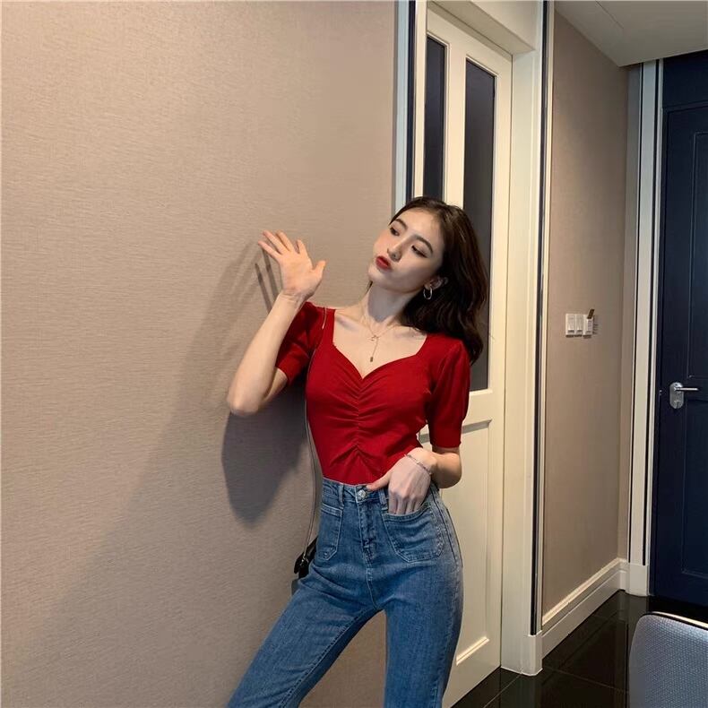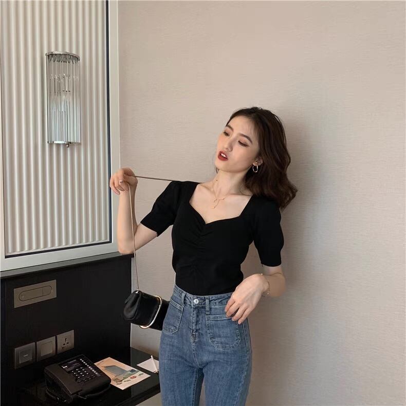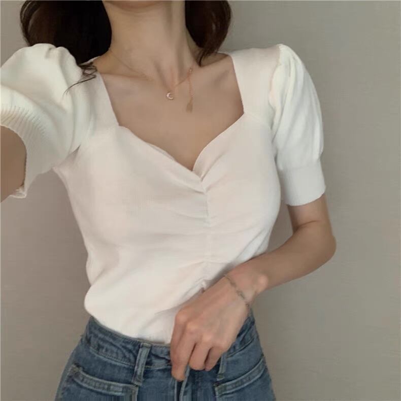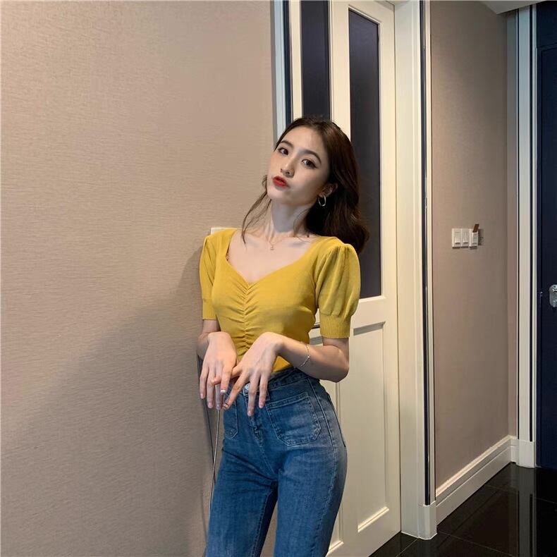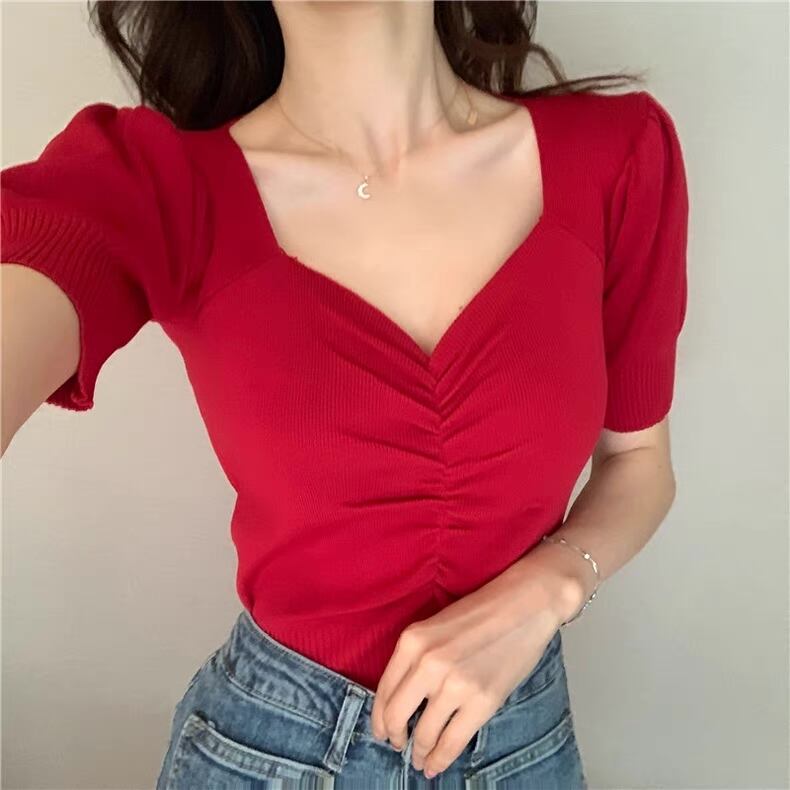 トップス Tシャツ カットソー ニットソー ショート丈 袖あり 半袖 パフスリーブ Vネック スリム 無地 かわいい 大人可愛い きれいめ シンプル カジュアル おしゃれ お洒落 こなれ感 ラフ ルーズ 抜け感 春 夏 10代 20代 30代 40代 レディース 女性用 デート お出かけ 女子会 休日 ショッピング 公園 着回し 普段使い 韓国 韓国系 オルチャン ファッション コーデ スタイル モテ デイリー カラー パープル アプリコット ホワイト イエロー レッド ブラック 黒 サイズ S M L