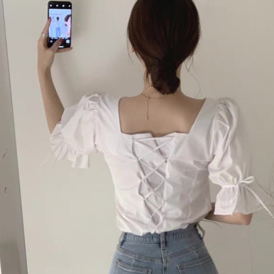 トップス シャツ ブラウス クロップド丈 ショート丈 半袖 パフスリーブ スクエアネック リボン バックシャン バックコンシャス レースアップ 無地 かわいい 大人可愛い シンプル 大人 おしゃれ お洒落 キュート ガーリー ドーリー フェミニン 春 夏 10代 20代 30代 40代 レディース 女性用 デート お出かけ 女子会 休日 ショッピング 公園 着回し 普段使い 韓国 韓国系 オルチャン ファッション コーデ スタイル モテ インスタ映え デイリー 色展開 白 ホワイト サイズ フリーサイズ