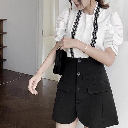 くしゅっとしたシャーリングパフスリーブが、可愛いらしいホワイトシャツ。