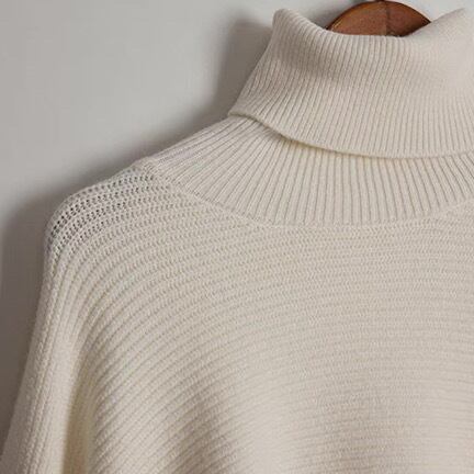 アシンメトリーな左右の袖が印象的な、ハイネックニットセーター。