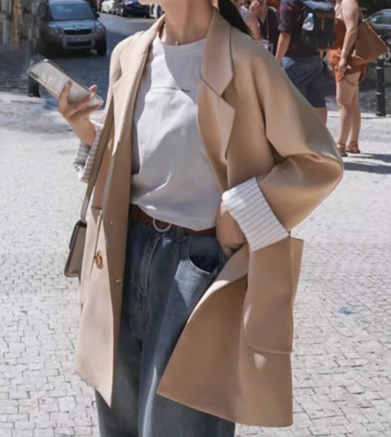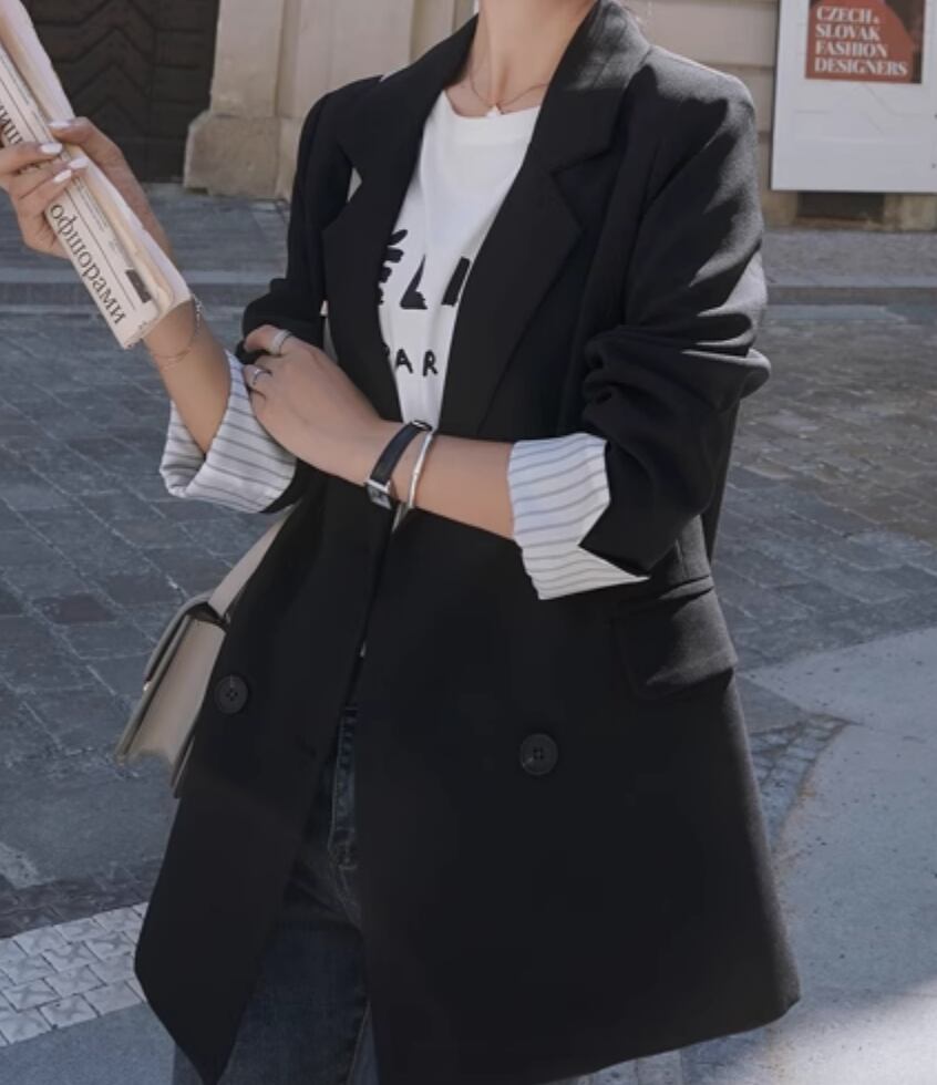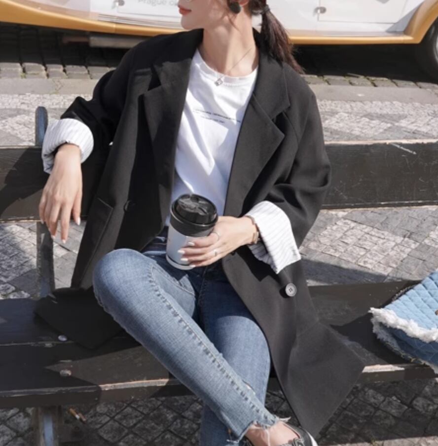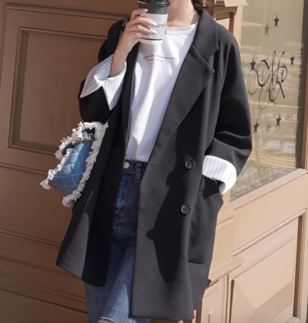 シックで上品な雰囲気を演出するジャケットです。袖の丈が長めで、女性らしいシルエットを作り出します。かっちりしすぎないデザインなので、カジュアルからきれいめまで様々なスタイルにマッチします。一枚で主役級の存在感を放ちつつ、抜け感もプラスできる一着です。