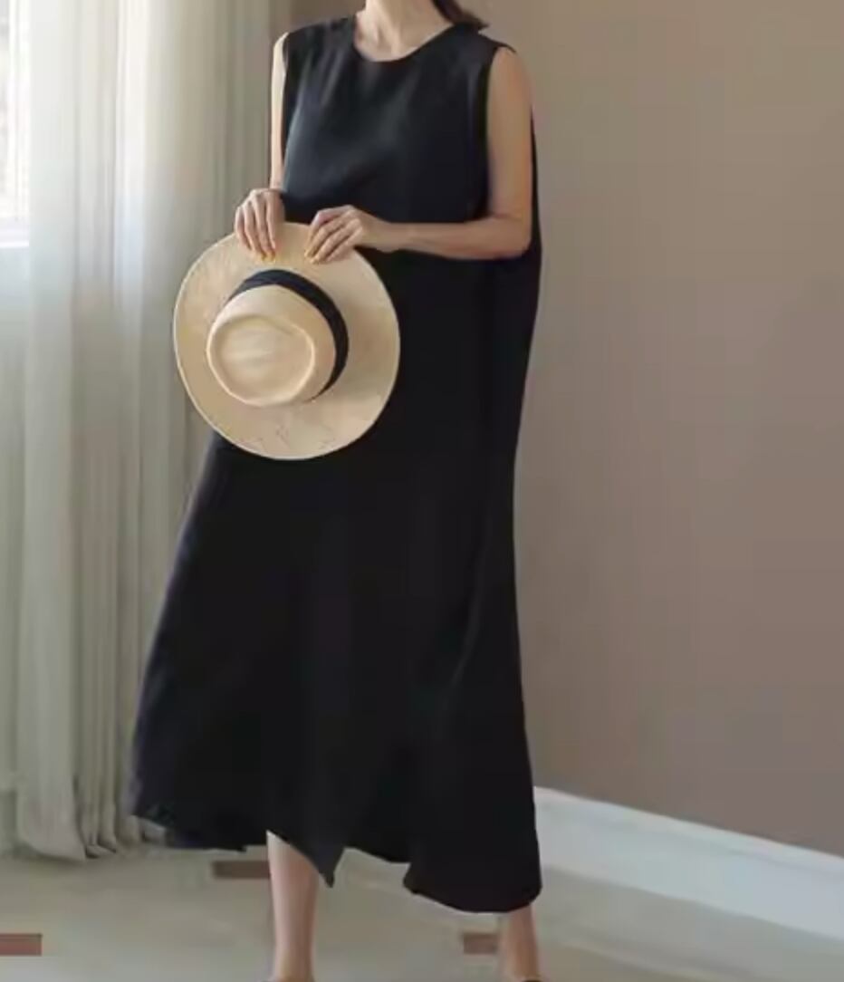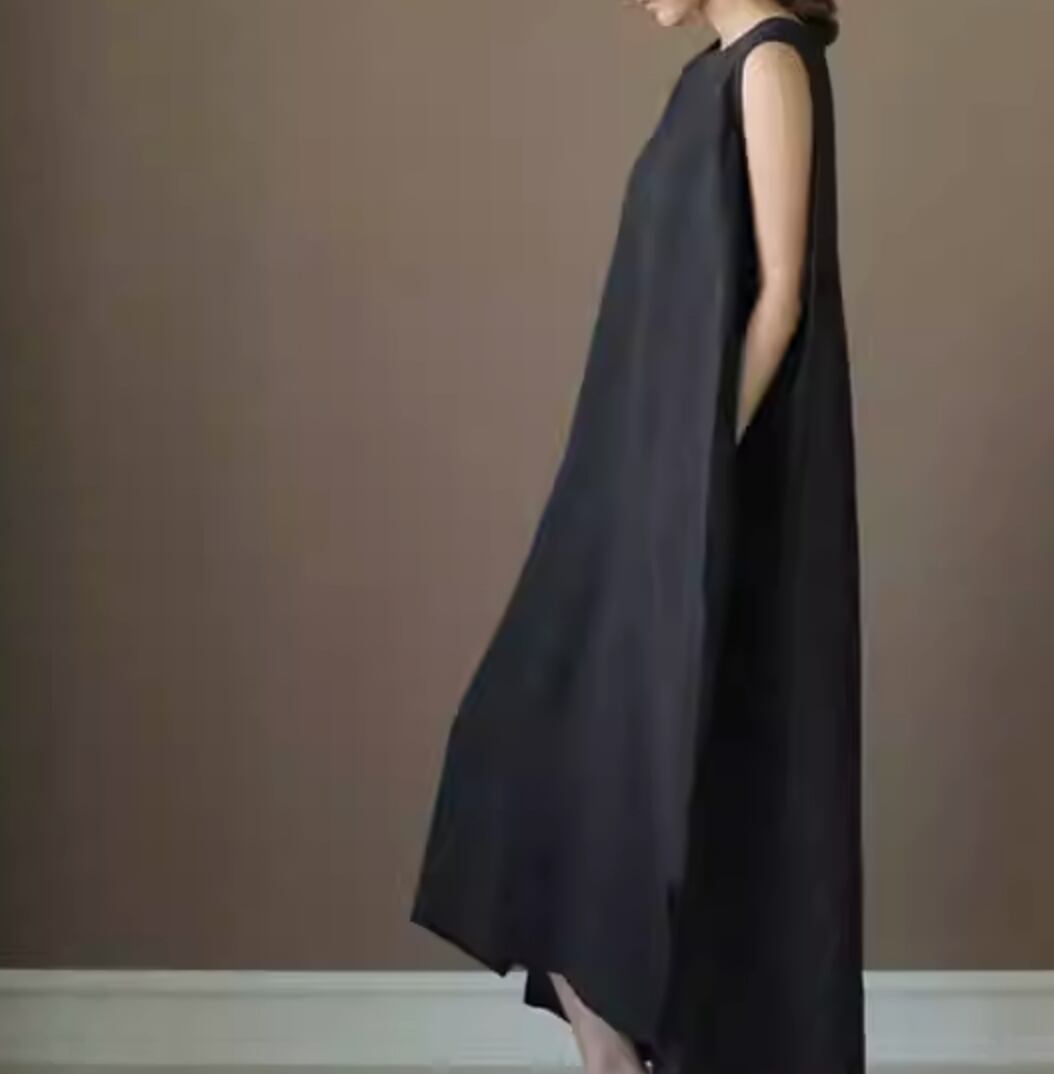 シックな雰囲気漂うワンピースです。どんなスタイルにも合わせやすいシンプルなデザインながら、上品さと女性らしさを引き立てます。ロング丈でありながらノースリーブという夏らしい着心地も魅力的。一枚で存在感を放つ主役級のアイテムです。