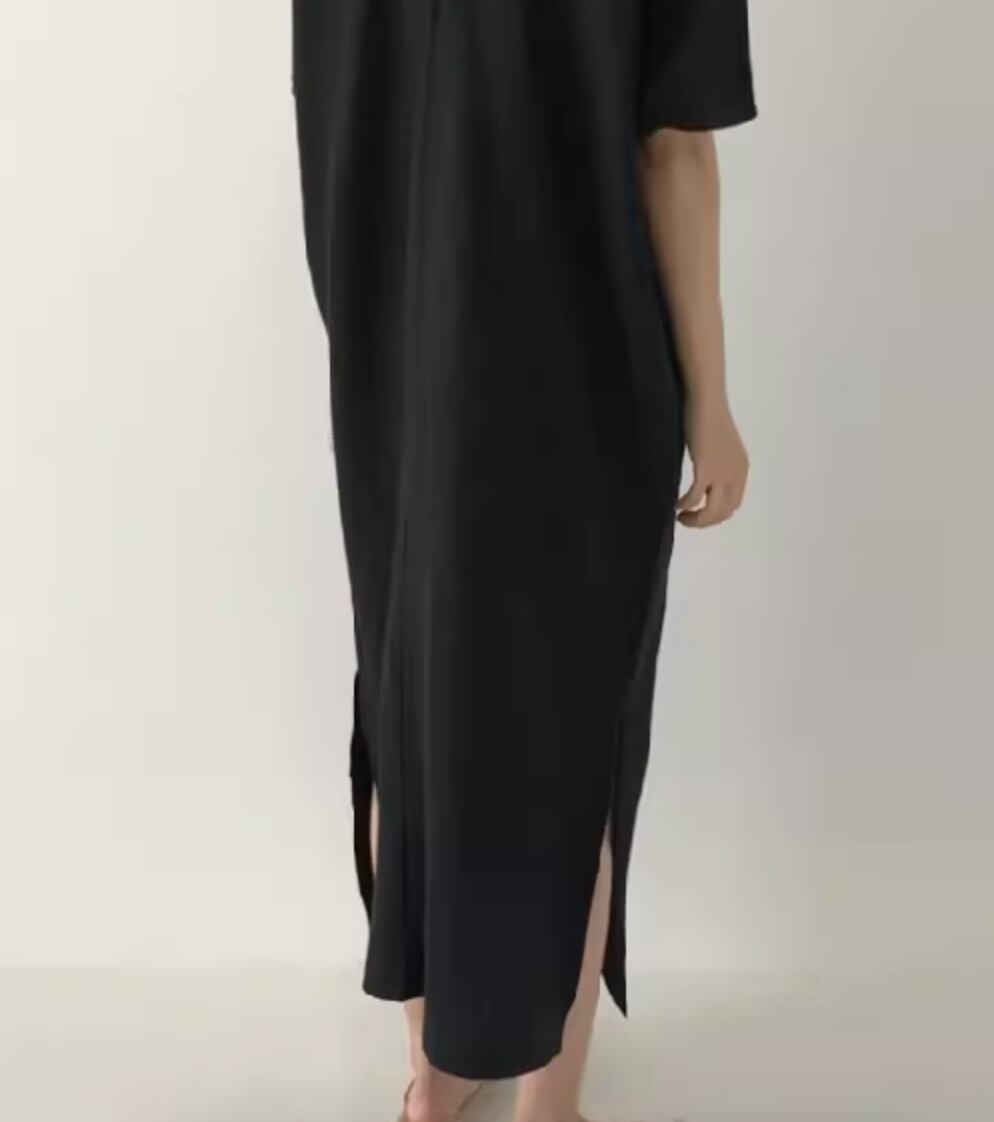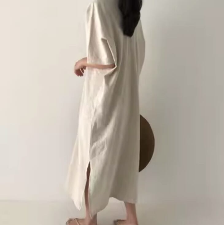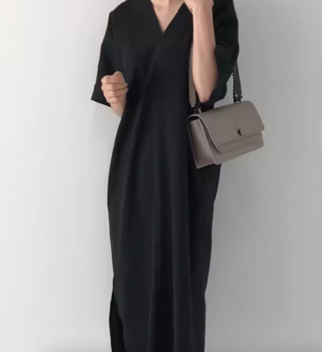 ワンピースはシックで上品な雰囲気が特徴です。Vネックと半袖のデザインが女性らしさを引き立て、長めの丈で体型をカバーしてくれます。シンプルで、様々なスタイルに合わせやすく、大人可愛いコーディネートを楽しむことができます。