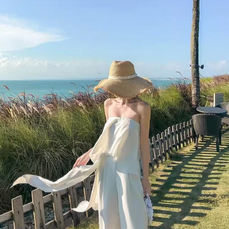 チューブトップ レディース パンツ オールインワン 袖なし オフショルダー 襟なし ネクタイ付き ワイド フレア ストレート ハイウエスト かわいい きれいめ シンプル カジュアル 上品 おしゃれ アジアン エスニック エキゾチック 個性的 クール モード系 モダン 主役級 存在感 ナチュラル 無地 夏 OL 学生 デート お出かけ お泊まり パーティー イベント リゾート 旅行 女子会 休日 ショッピング 合コン コンパ カフェ 体型カバー 普段使い 着回し XS ホワイト