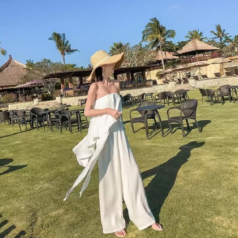 爽やかな夏の装いにピッタリなチューブトップパンツです。袖なしのオフショルダーデザインとワイドフレアのパンツが、女性らしい印象を与えます。ハイウエスト設計で脚長効果も期待できます。ネクタイ付きで襟なしのシンプルなデザインは、様々なシーンにマッチし、さまざまなスタイルにコーディネートできます。上品なカジュアルからカフェや合コン、パーティーなどの特別なイベントまで、幅広い場面で活躍します。さらに、モダンで個性的なデザインで存在感を演出できるアジアンやエキゾチックな雰囲気も魅力です。