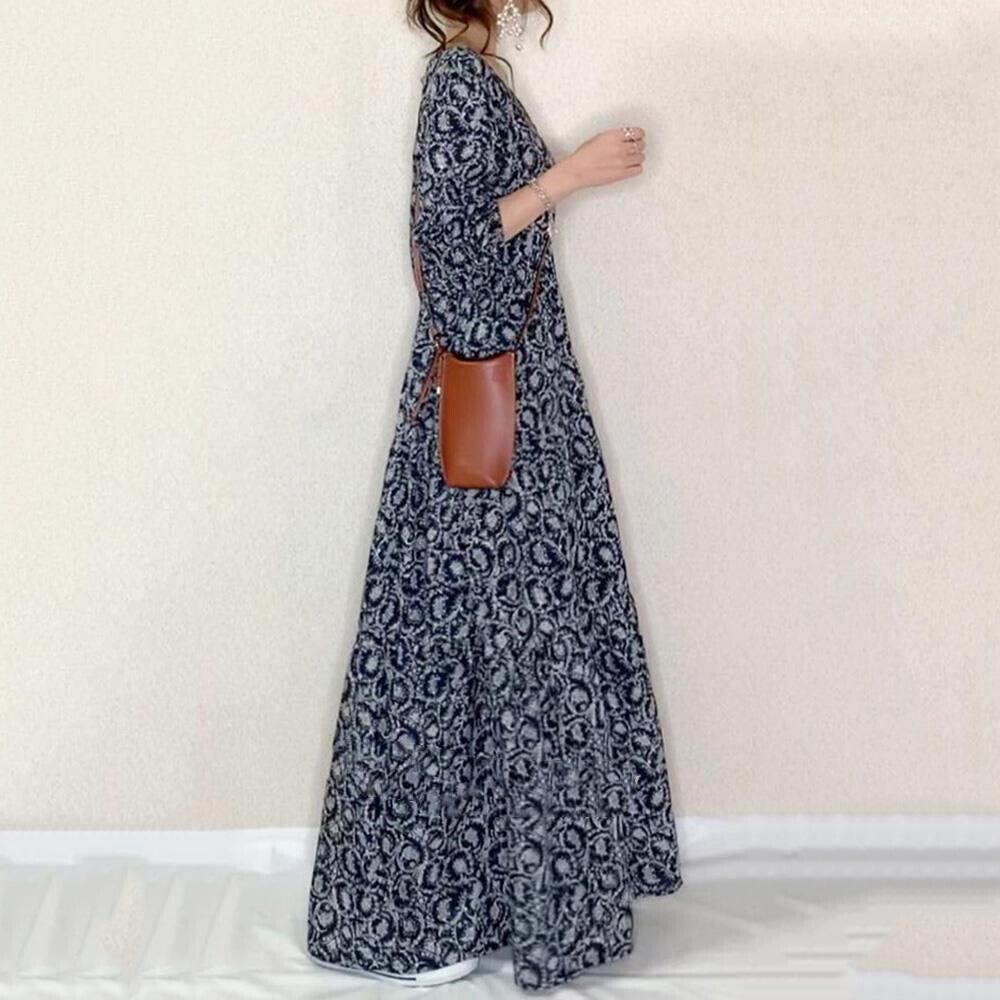 レディース スカート ワンピース フレアスカート フレアワンピース ワンピドレス ロング ロング丈 マキシ マキシ丈 袖あり 長袖 Vネック 襟なし セミフレア Aライン かわいい 大人可愛い きれいめ 大人 上品 おしゃれ お洒落 レトロ アジアン エスニック エキゾチック こなれ感 ラフ ラブリー キュート ガーリー エレガント 主役級 存在感 柄 花柄 春 夏 秋 バレンタイン 10代 20代 女性用 ホテル レストラン 着回し 普段使い 楽ちん 体系カバー 美脚 脚長 流行 インスタ映え ネイビー