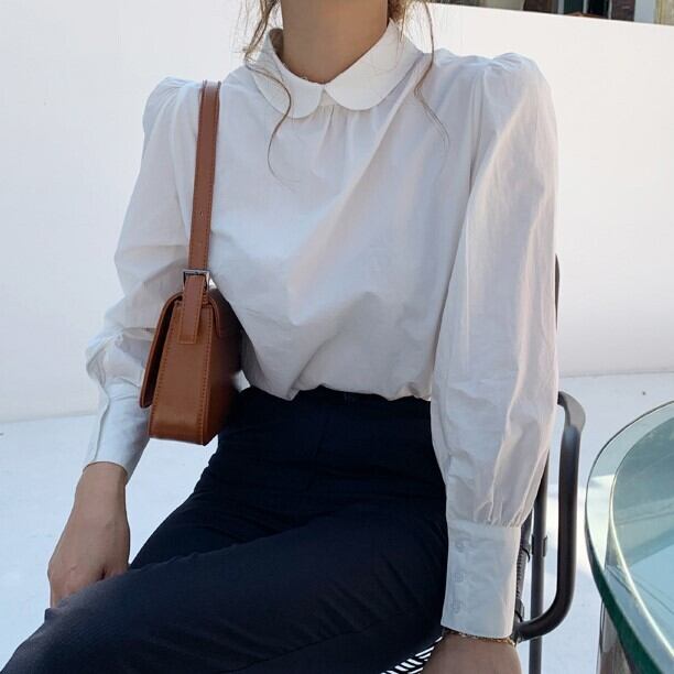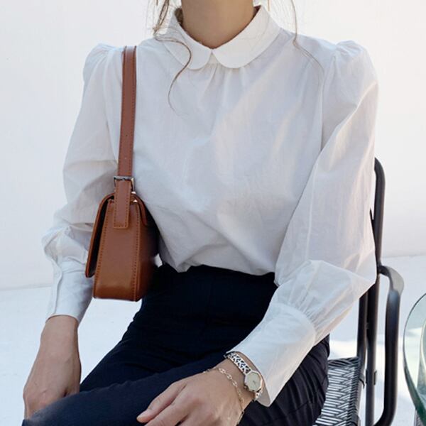 オシャレで可愛いシャツ。丸襟やパフスリーブ、ストレートカットなど、女性らしい要素がたくさん詰まった一枚。薄手のコットン素材で、春や秋の季節にもぴったり。大人可愛い、きれいめなスタイリングにも合わせやすく、主役級の存在感を発揮します。シンプルさと上品さのバランスが絶妙で、レトロやこなれ感のあるスタイルにもよく合います。