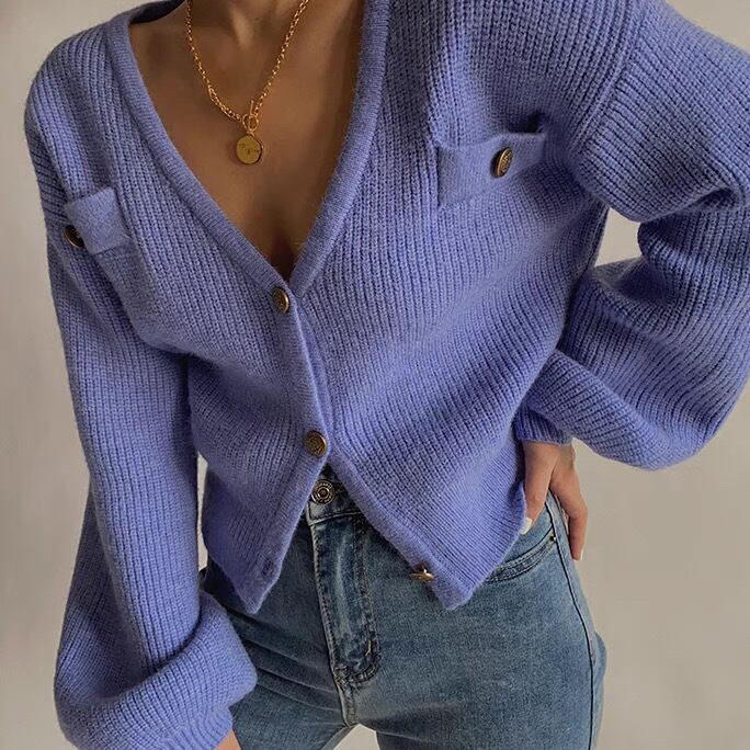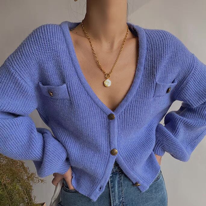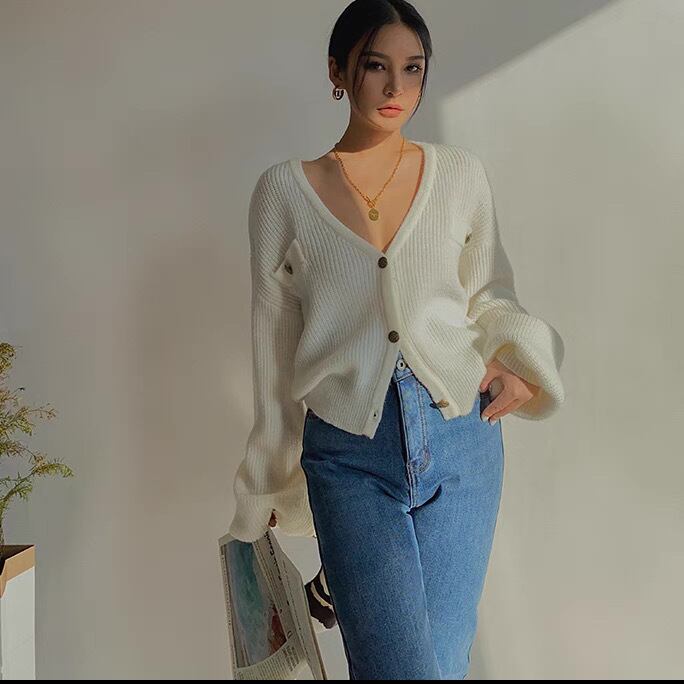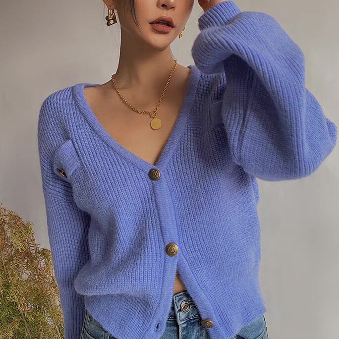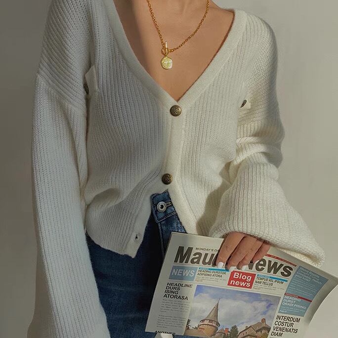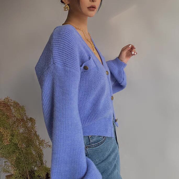 トップス カーディガン セーター ニット 上着 羽織 クロップド丈 ショート丈 袖あり ボリューム袖 ぽわん袖 長袖 Vネック スリムフィット 無地 きれいめ シンプル カジュアル おしゃれ お洒落 こなれ感 抜け感 ストリート かっこいい クール セクシー 秋 冬 10代 20代 30代 40代 レディース 女性用 デート お出かけ 女子会 休日 ショッピング 公園 着回し 普段使い 重ね着 韓国 韓国系 オルチャン ファッション コーデ スタイル デイリー 色展開 青 ブルー 白 ホワイト ワンサイズ
