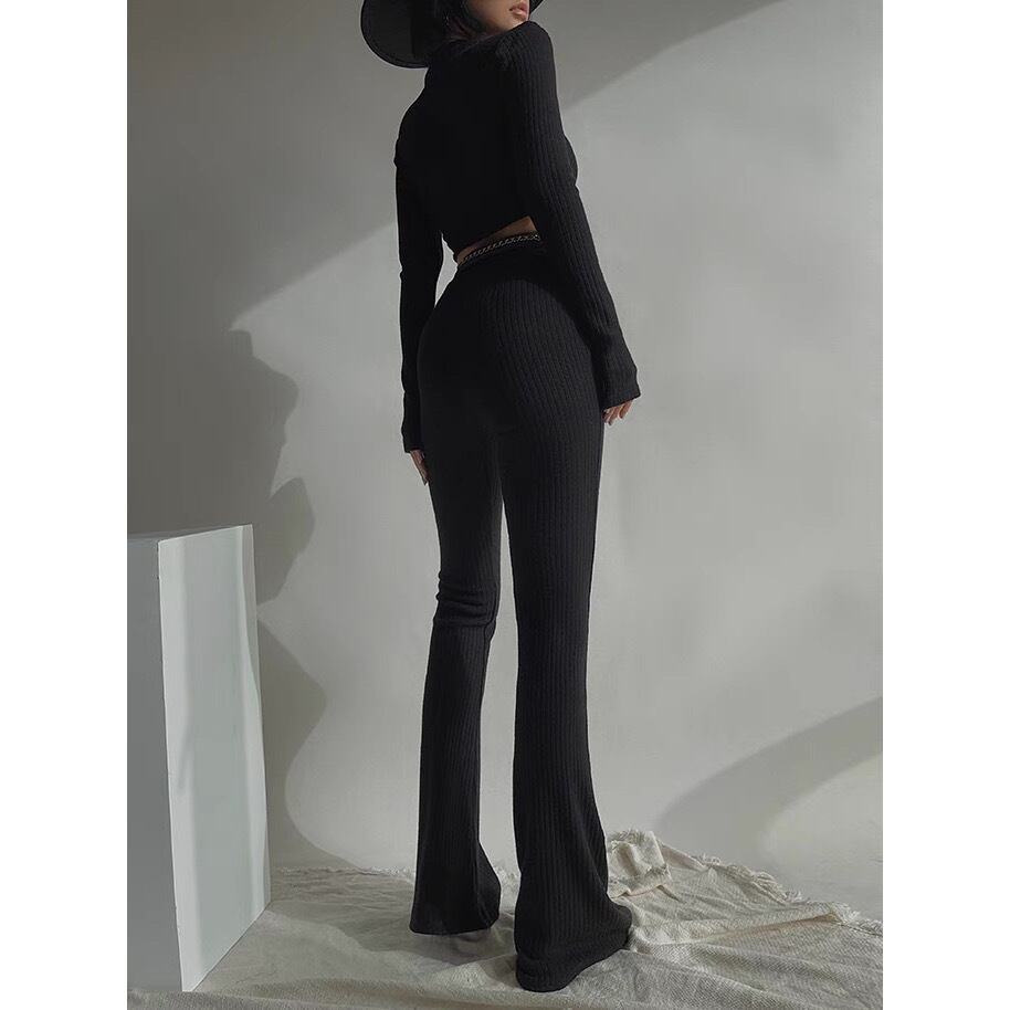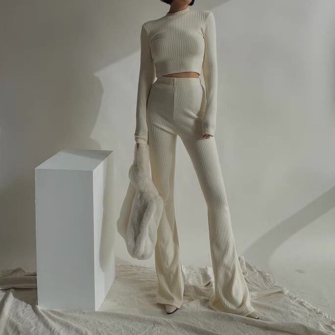 リブニットのカットソーとフレアパンツの上下2点セット。