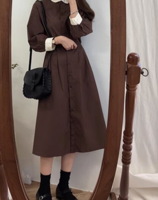 ワンピース ミモレ 長袖 かわいい 大人可愛い きれいめ シンプル カジュアル 上品 おしゃれ かっこいい レトロ こなれ感 ラフ ガーリー ルーズ 個性的 クール モード系 エレガント モダン 主役級 存在感 抜け感 ヴィンテージ ラブリー キュート ゴシック 都会的 ラグジュアリー クラシカル ロマンティック ナチュラル OL 学生 デート お出かけ イベント 旅行 女子会 休日 ショッピング カフェ コーデ 楽ちん 普段使い 着回し モテ インスタ映え S M L XL ブラウン ネイビー