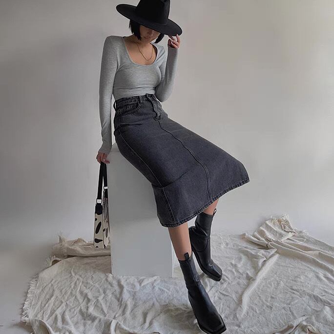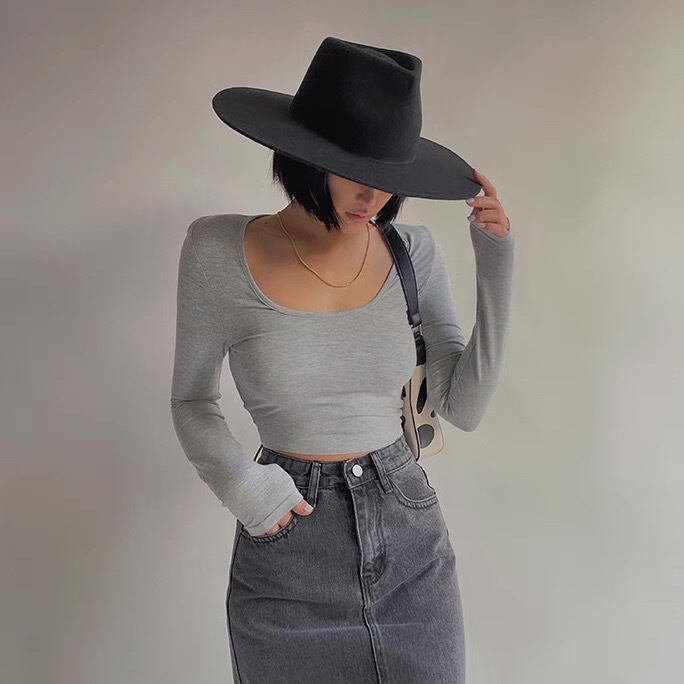 鎖骨まわりがざっくりと大きく開いているのが印象的なシンプルなロングTシャツトップス。